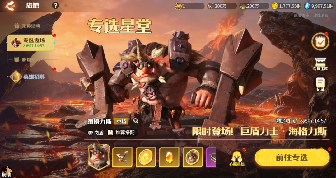 活动时间:2026/1/21 00:00 ~ 2026/1/29 24:00活动等级:主堡4级开启。活动简介:【全部】专选英雄限时返场。使用龙币(专选1次=120龙币,专选5次=580龙币)购买星堂钥石参与专选即有机会获得英雄、信物、意志之证、钥石残片等奖励。使用意志之证可在活动专属兑换商店——专选宝库中兑换英雄专属龙石;使用钥石残片可兑换英雄邀请函、秘焰晶核等道具。活动期间,参与活动签到赠礼累计7天可领取星堂钥石*10。活动奖励:专选英雄及其专属龙石、意志之证等;