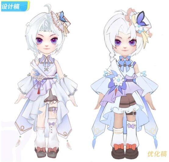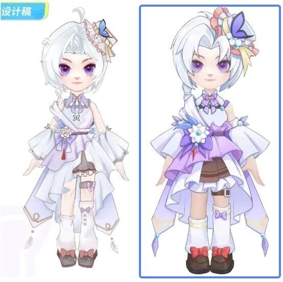 具体调整如下:1.简化发型,去掉额前辫子,使轮廓更清晰;2.将蝴蝶结、珠子等配饰调整为更圆润的Q版风格,贴合整体美术基调;3.优化裙摆层次与蓬松度,增强整体连贯性。