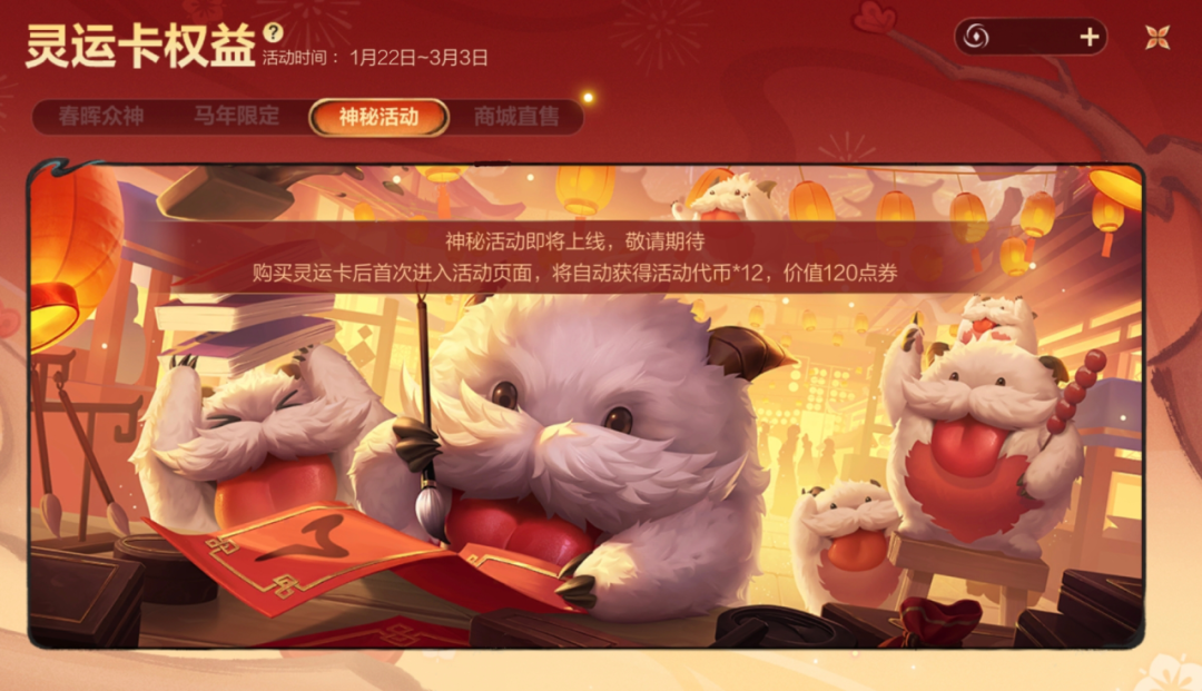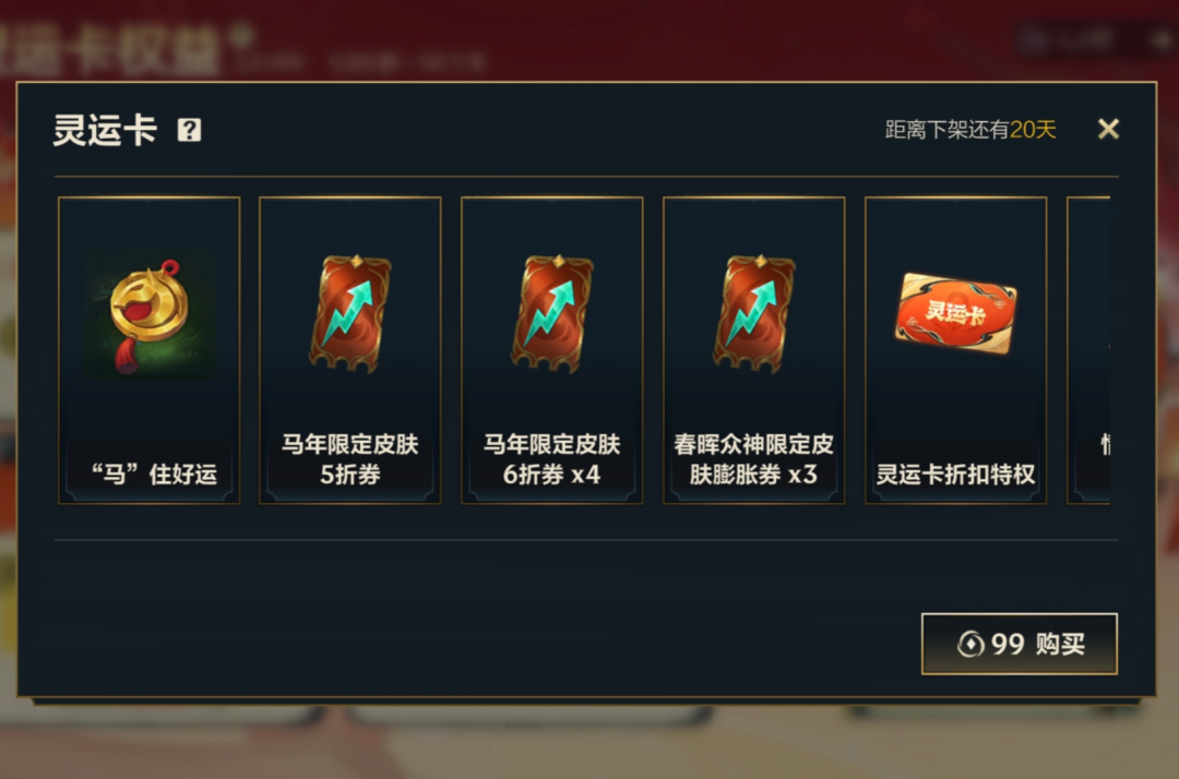 1月22日版本更新后-3月3日活动期间,召唤师在商城花费99点券即可购买灵运卡,限购1次,礼包内包含: