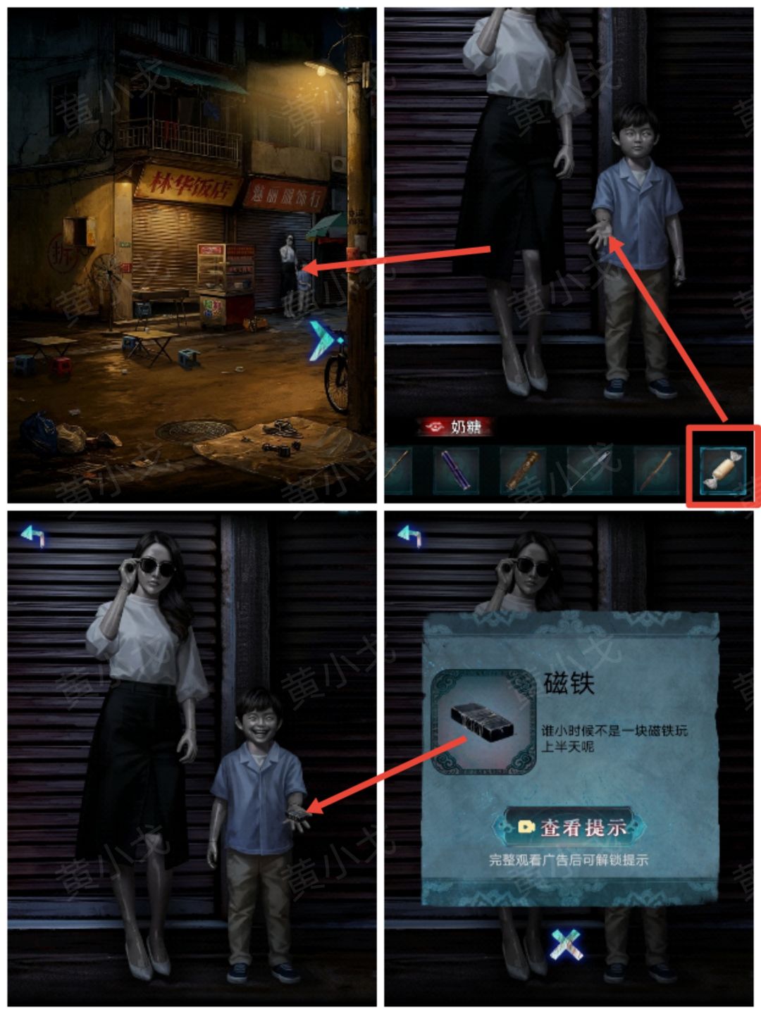 1.根据[香烛店]册子上的线索,拿【奶糖】给男孩纸人,获得【磁铁】