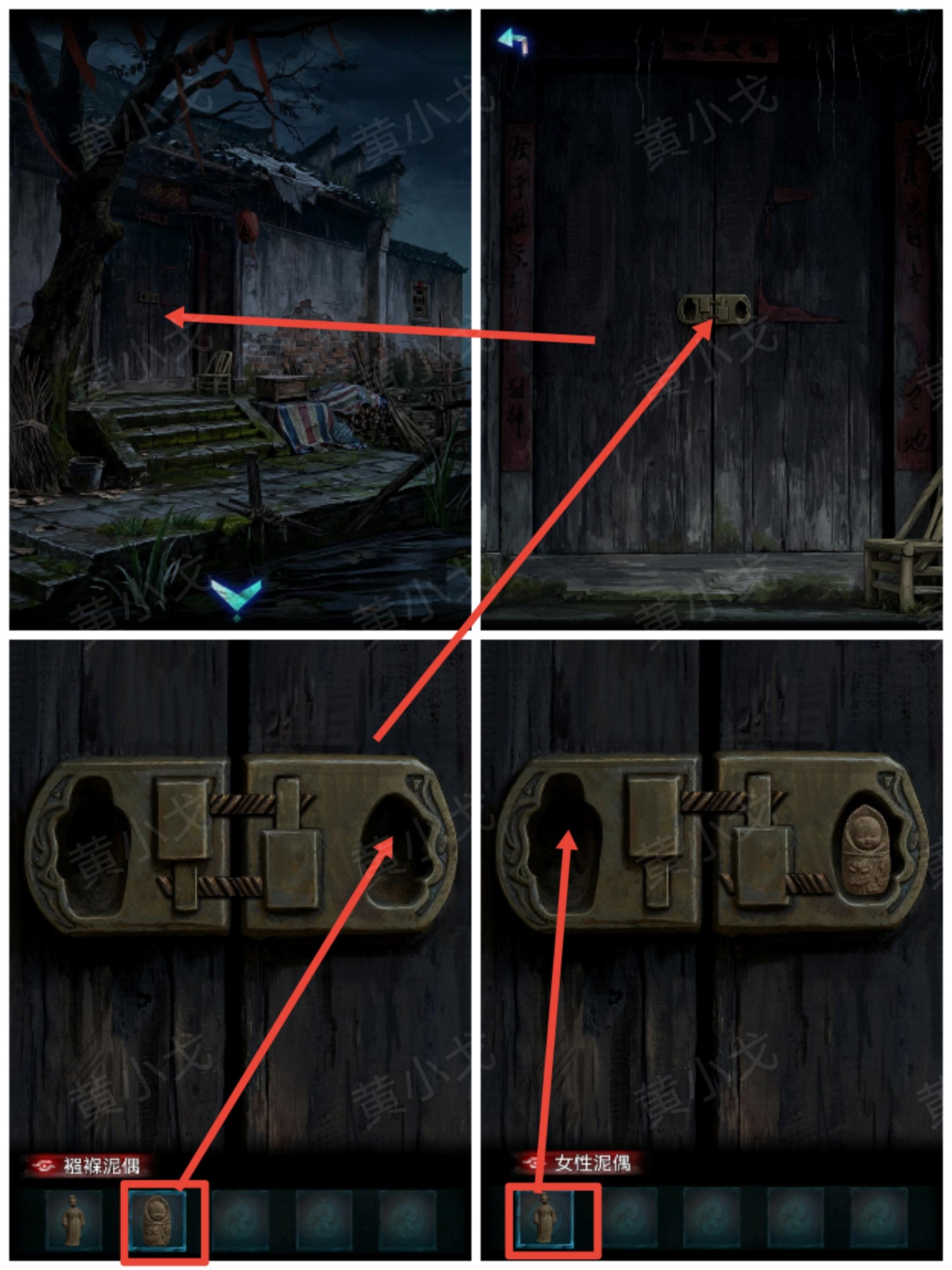 31.点击祖宅门上的机关,嵌入【女性泥偶】和【襁褓泥偶】,打开祖宅的门