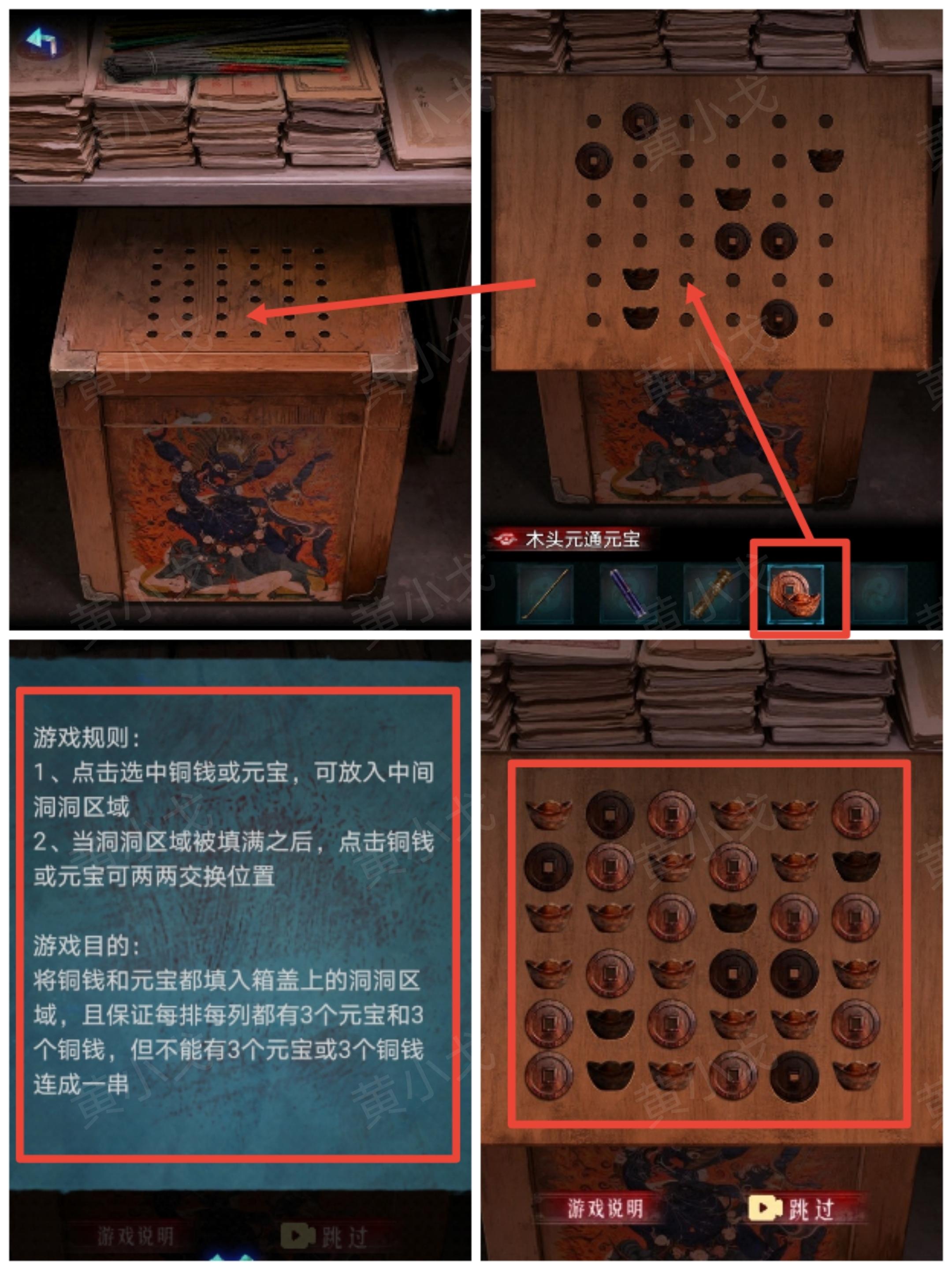 ②游戏目的:将铜钱和元宝都填入箱盖上的洞洞区域,且保证每排每列都有3个元宝和3个铜钱,但不能有3个元宝或铜钱连成一串