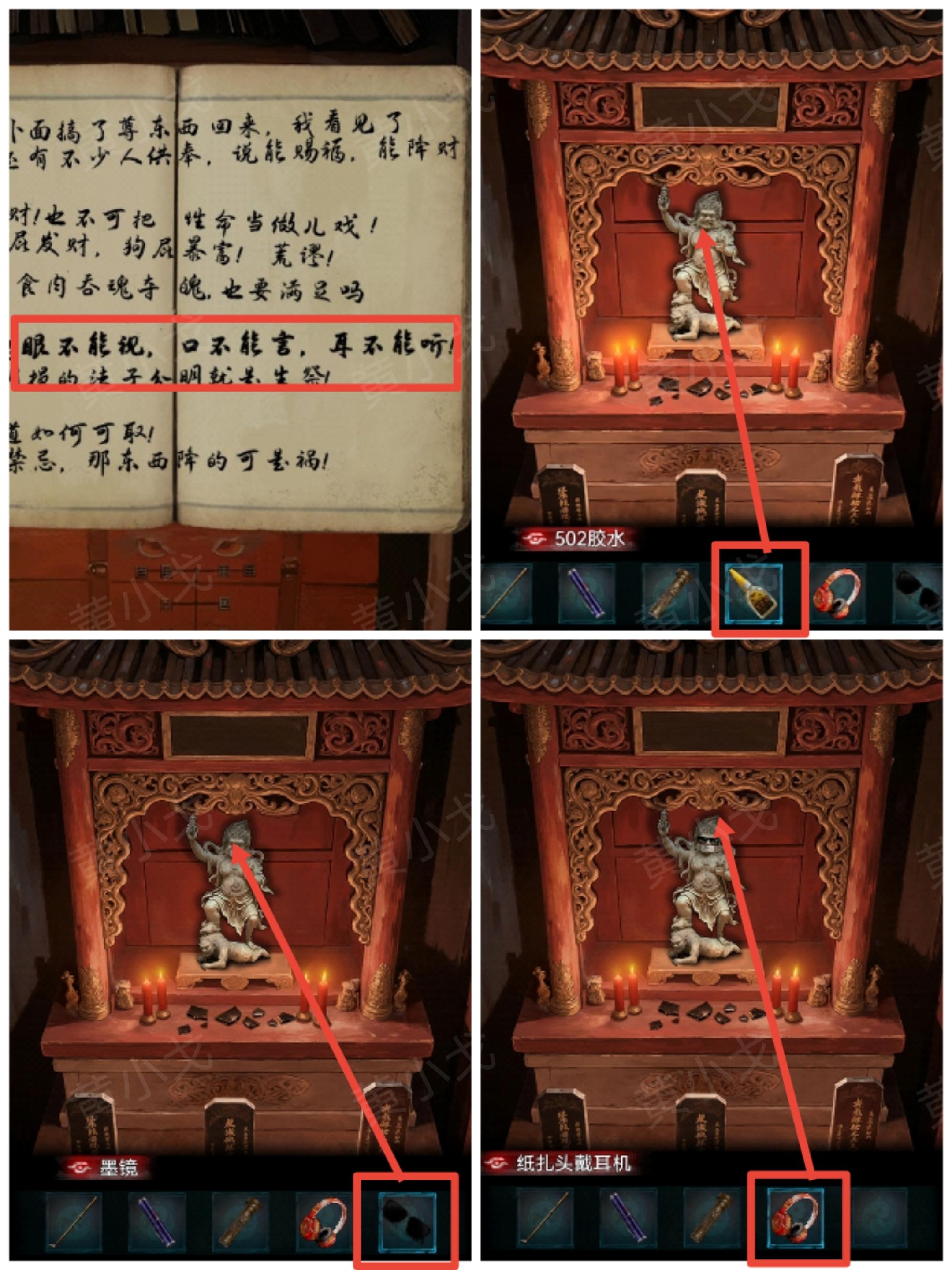 17.根据书本上的线索,用【502胶水】将神像的嘴巴粘起来,然后给神像戴上【墨镜】和【纸扎头戴耳机】(有小高能),纸人消失