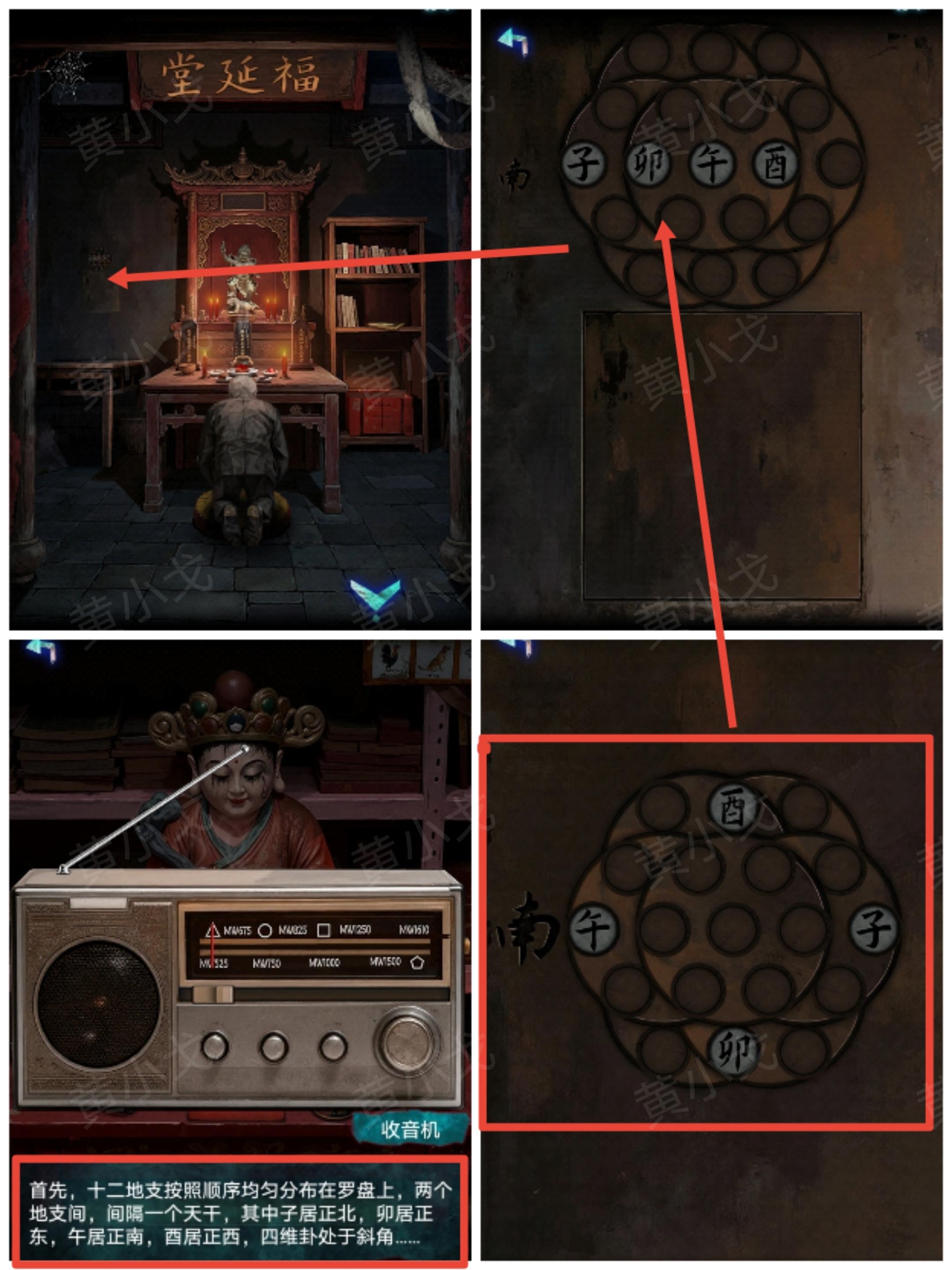 15.点击祠堂墙上的机关,根据收音机中的语音线索,调整滑块的位置