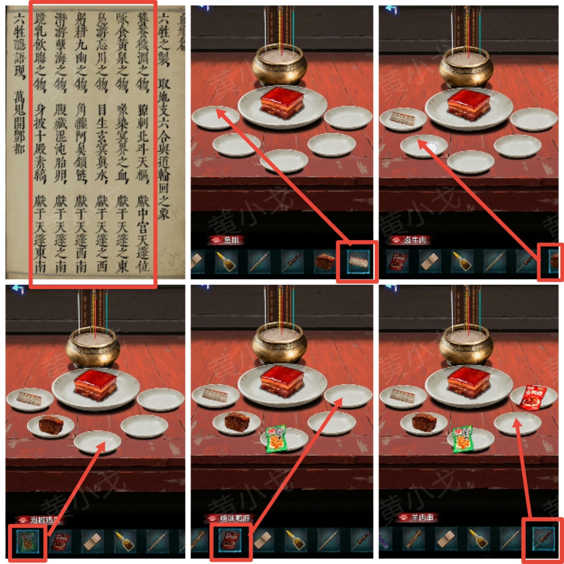 5.点击供桌上的香炉,插入【五色香】;根据书本上的线索,调整五色香的位置