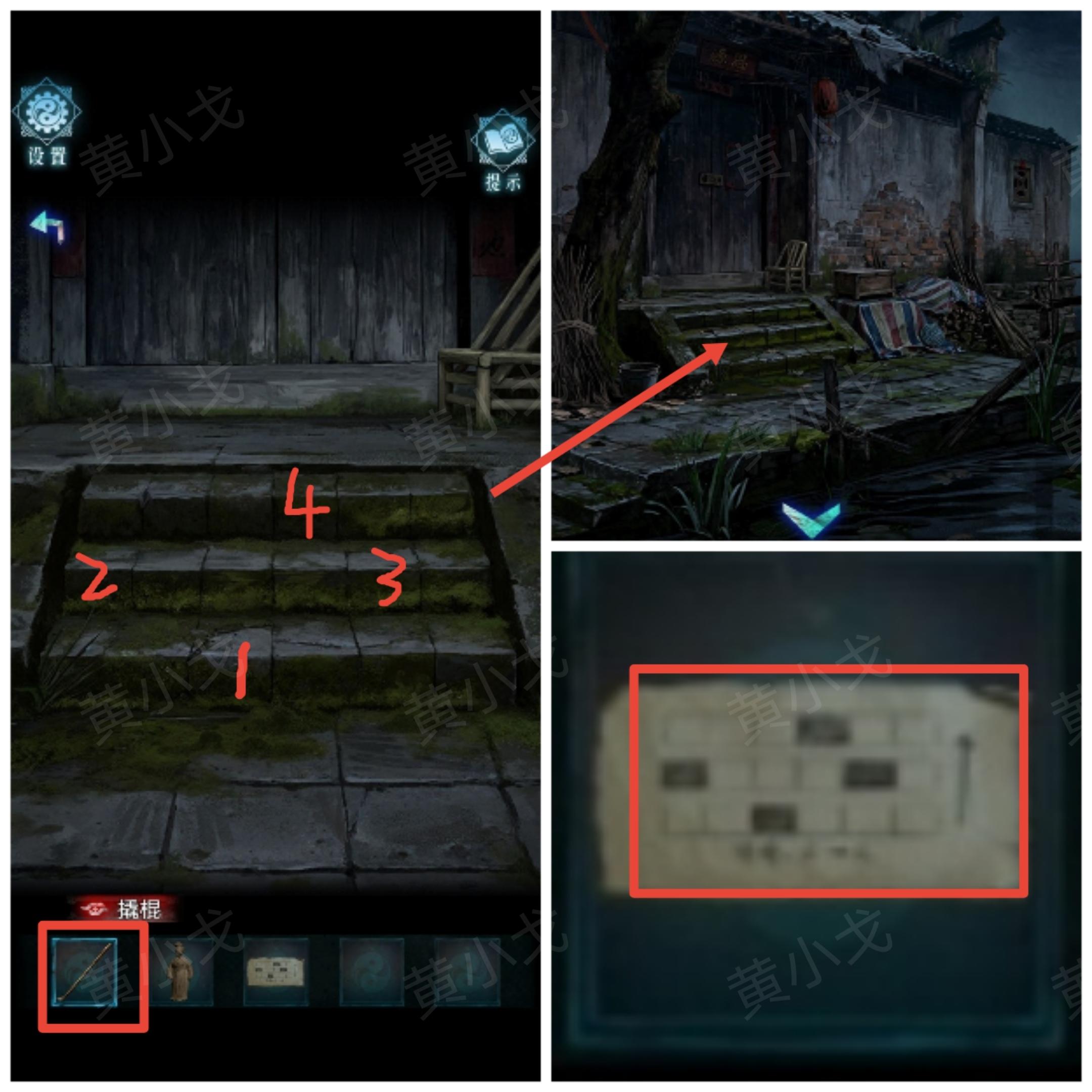 29.根据【方块纸条】上的线索,用【撬棍】按顺序敲击台阶上的砖头