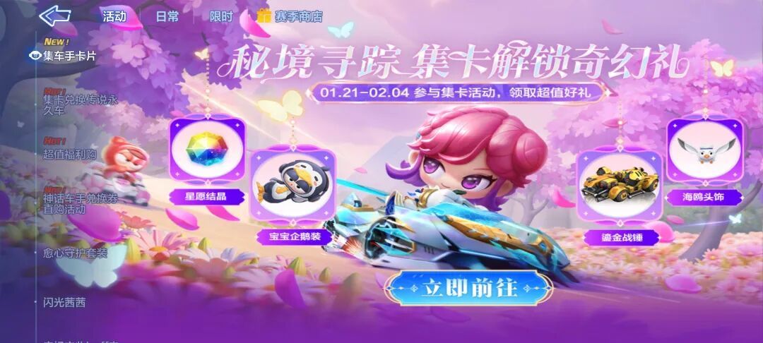 翩翩起舞的蝶,绕着花香四溢的小径盘旋,点点荧光指引花园深处的宝藏!1月21日10时起,秘境寻踪集卡活动开启,每日登录即可领取海量星愿结晶,更有全新传说竞速车【鎏金战锤】、活动限定【秘语芯片】、【海鸥头饰】、【棱镜车牌】、【宝宝企鹅装(365天)】等惊喜好礼待你兑换!