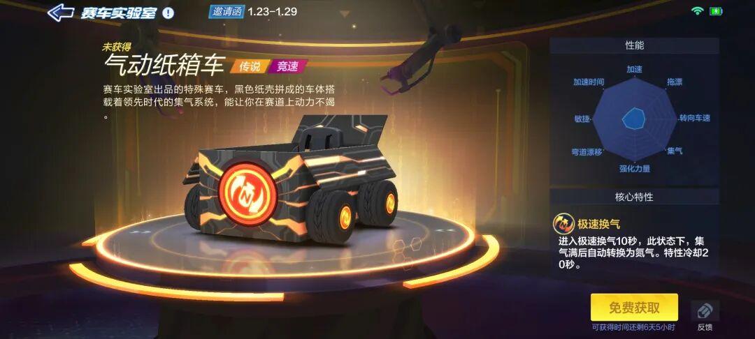 感受风与气的流动,将动力更快的转换!1月23日起,新一期赛车实验室开启,传说竞速赛车【气动纸箱车】登场,更快的集气更多的氮气,更强速度冲击!
