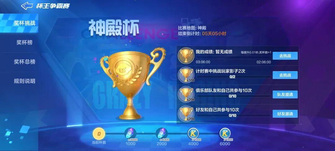 本次杯王争霸赛的主题地图为【神殿】,高速科技化轨道,炫目的霓虹灯条,迷醉的雕像灯光,雷电的漩涡在天际之上,倒转的城市宁静威严。宝宝期待着大家带来的跑图大赏!活动期间,车友们可通过完成活动的对应任务获得奖杯,用以兑换能量水晶和酷币。另外,奖杯总榜结算时前三名车友,更可获得对应赛道的车牌和赛车抵金券!