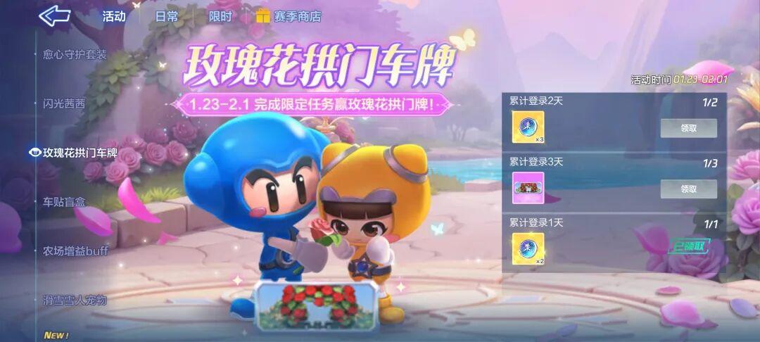 玫瑰的馥郁香气缠绕花园拱门,路过都能收获一天的好心情!1月23日起,累计登录3天即可免费领取全新【玫瑰花拱门车牌】、加速纹章,用鲜花装点车牌,装点赛道之梦~