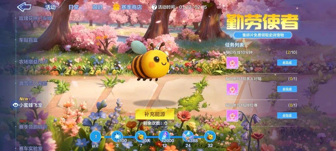 勤劳的小园丁们,在花丛中飞翔,飞累了就趴在花朵上睡一觉,才不是吃撑了呢!1月23日起,完成任务即可免费领取新史诗飞宠【小蜜蜂】,赛道和花丛都是小蜜蜂喜欢的地方~