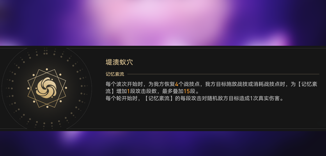 老规矩,我们先来看看这期的天气,也就是记忆紊流:每个波次时回复4个战技点,每次释放战技或者消耗战技点时,为记忆紊流叠加段数,每轮开始时记忆紊流造成最多十段真实伤害。