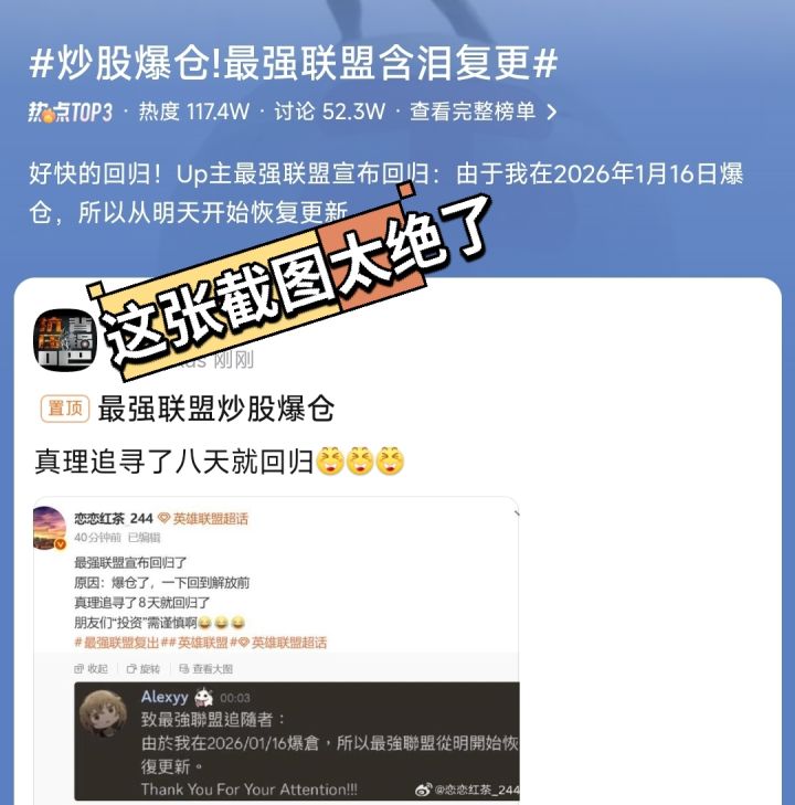 家人们游戏圈今天有个挺戏剧的事儿,此前因为炒股赚爆的英雄联盟up主“最强联盟”宣布回归