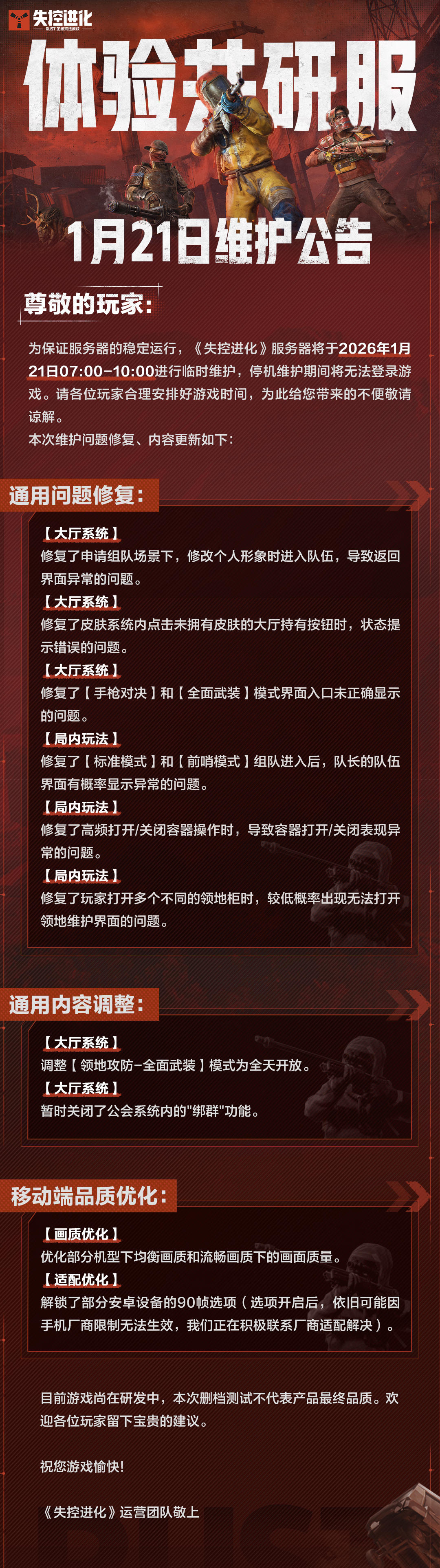 ⏰服务器计划将于2026年1月21日07:00-10:00进行例行维护,停机维护期间将无法登录游戏。