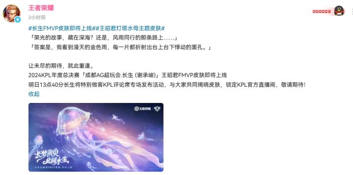 千呼万唤始出来! 王者荣耀官方已正式官宣,王昭君FMVP皮肤将于2026年1月23日正式上线!这款皮肤是2024年KPL年度总决赛FMVP选手长生(谢承峻)的专属定制皮肤,从确定归属到正式上线已等待超过13个月,如今终于迎来揭晓时刻。