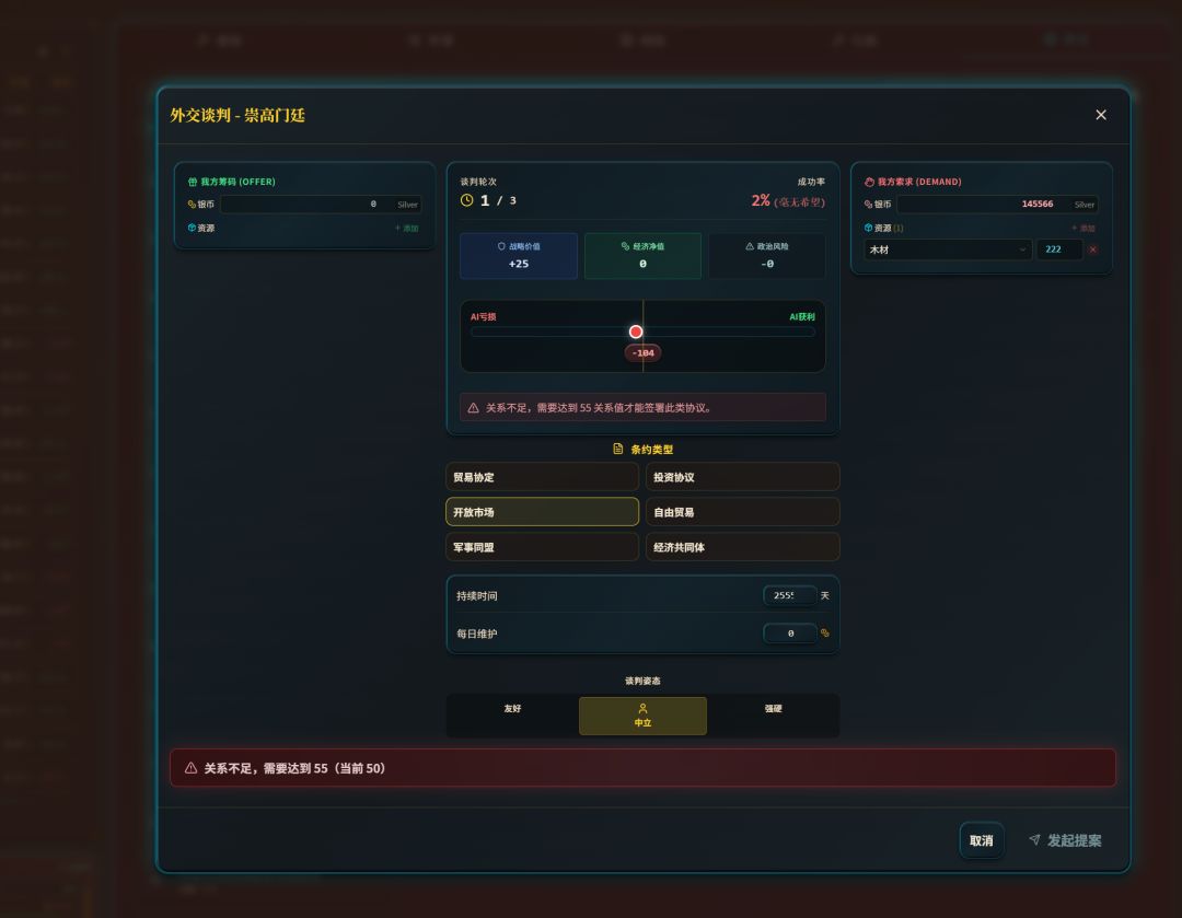 - 高外交 → 贸易利润加成、改善邻国关系。