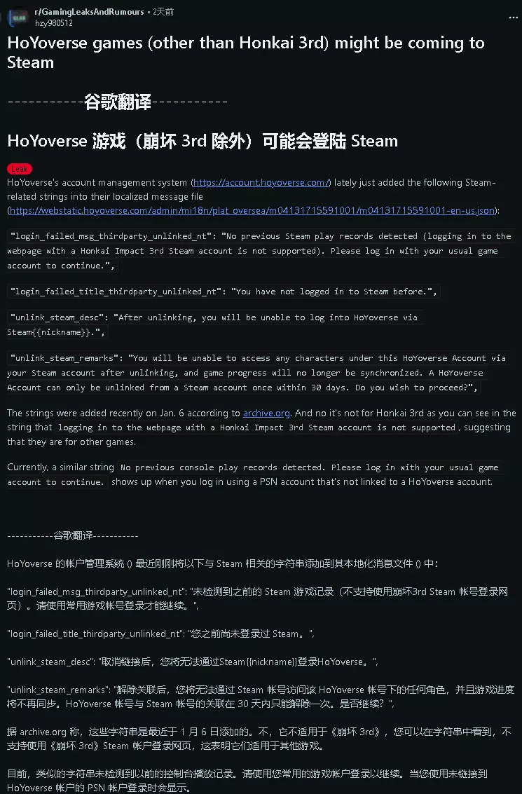 据了解,网友表示在最近更新的HoYoverse账号系统,代码中明确出现了“绑定Steam账号”、“使用新的Steam账号登录”以及“解绑Steam账号”等功能描述,疑似米哈游已经进入了Steam账号接入的最后测试阶段。