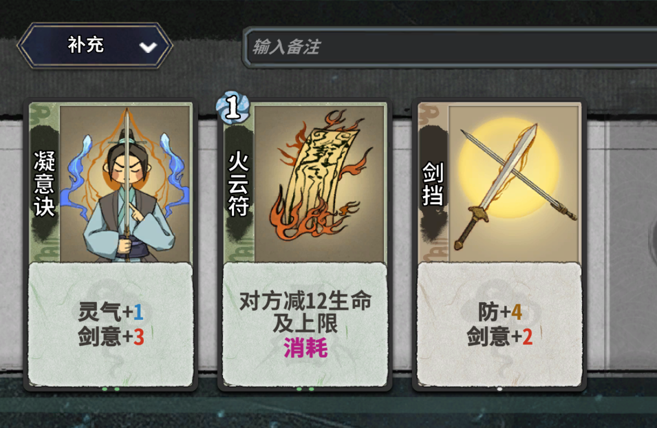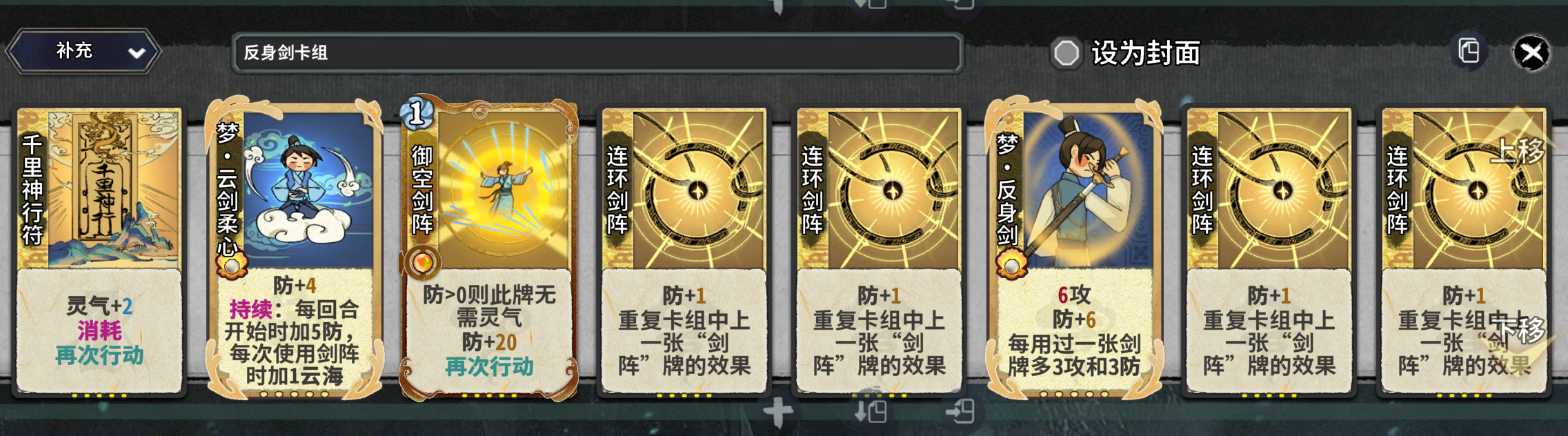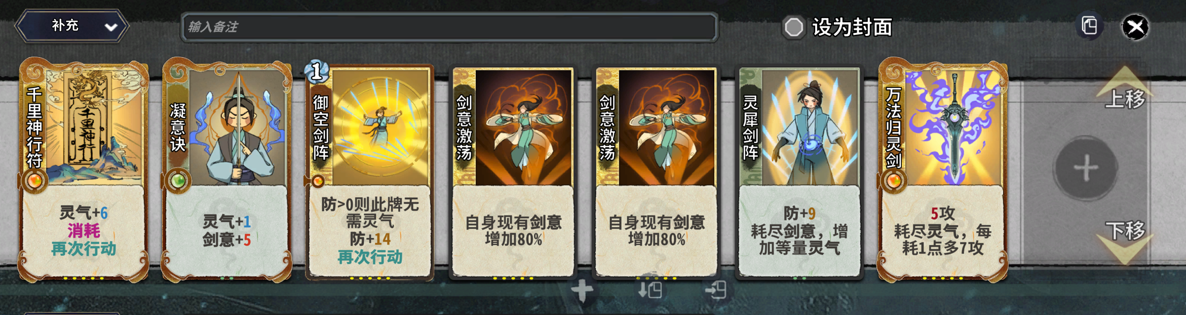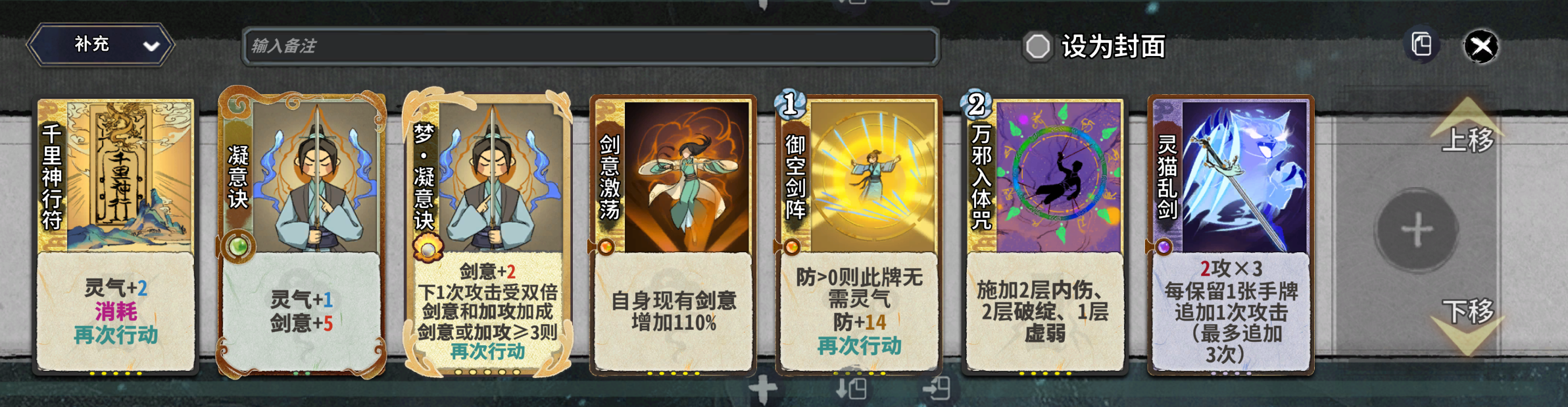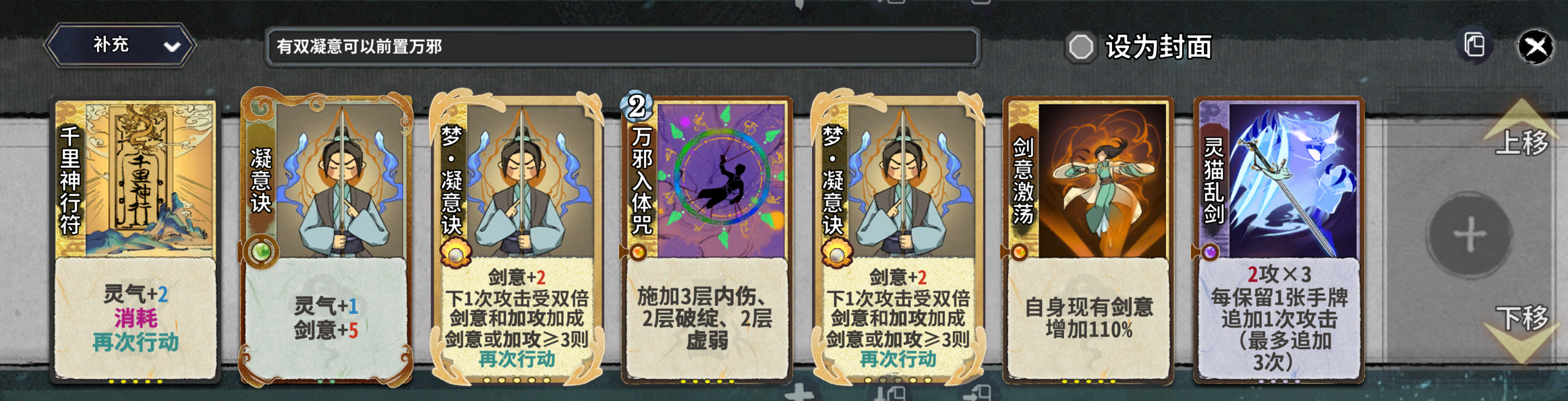筑基卡组,万邪更重要了,后续千里只有一张的话,可能会没蓝出,所以不建议用水气符形意剑那套来打。