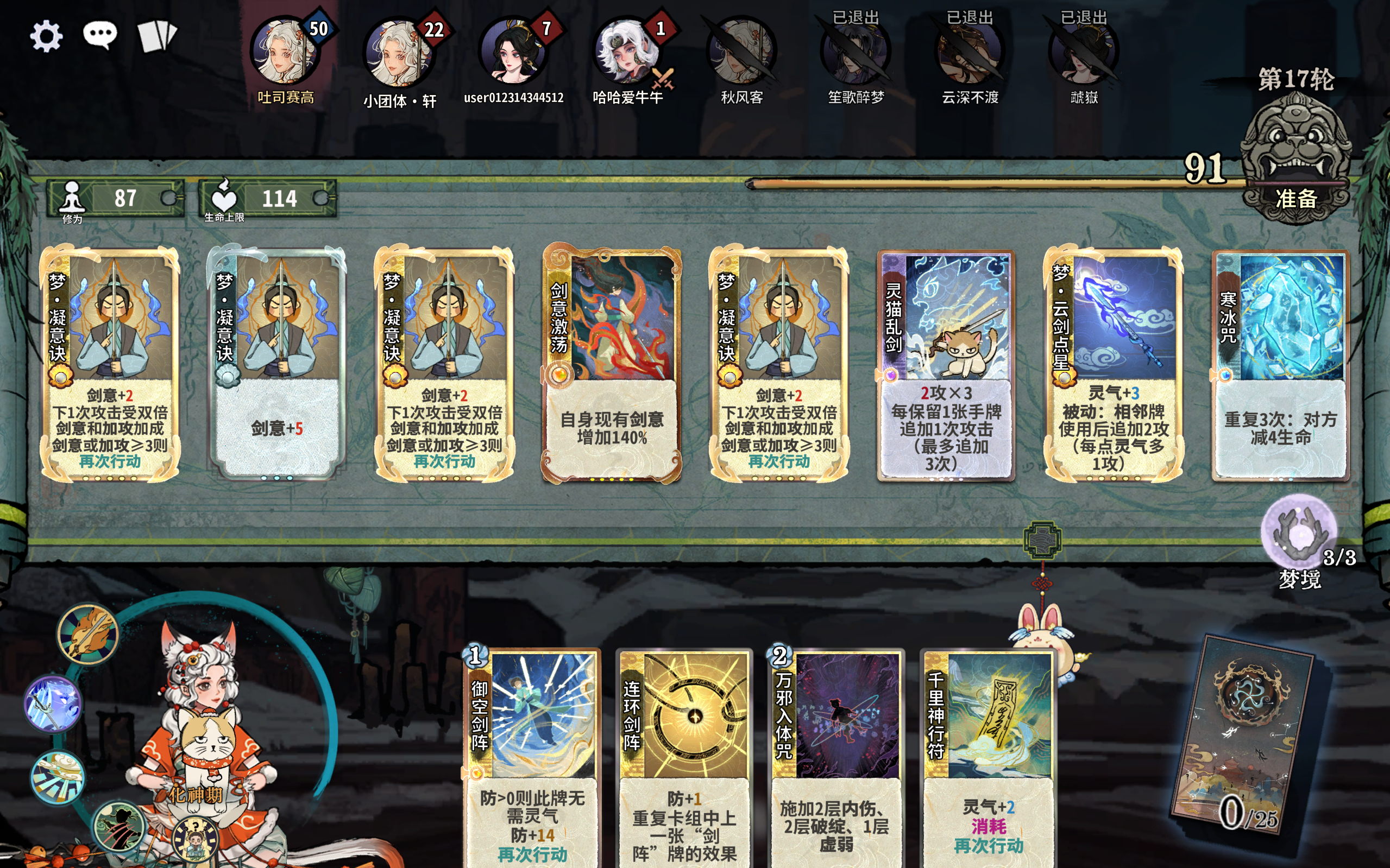 一轮D两下梦牌,二轮留三张卡上本,八轮上金丹元婴,筑基拿一张卡,顿悟和雷劫都不拿,元婴拿猫剑,其他仙命都拿修,如果没有梦凝意,记得第八轮D完,防止金丹出顿悟吃D。