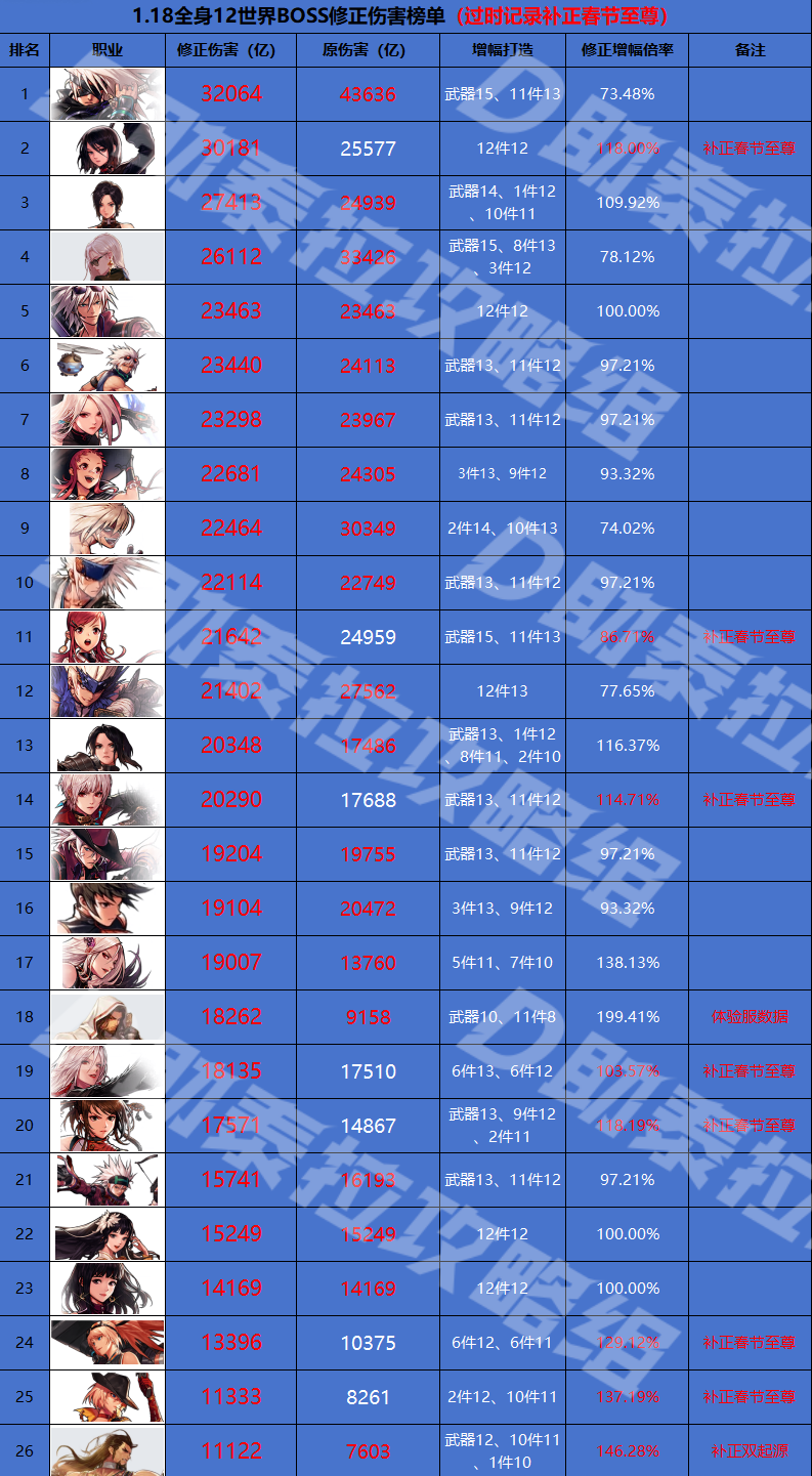 备注:上述排行将所有职业的增幅修正为全身12,已经加入增幅属性中的力智、攻击和技攻,个别更新前的数据额外补正了春节至尊的数据,男蓝拳单独补正了双起源的技攻数值,本排行的原伤害数据来源于每周统计的各职业单人世界boss伤害