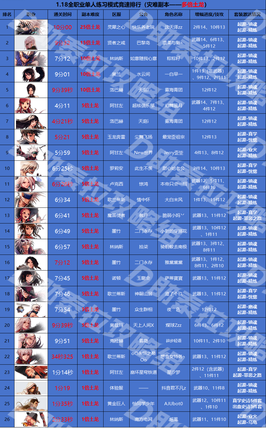 备注:数据截止于1.18,多倍血量土龙,数据来源为网络或者游戏内收集,均有实际截图记录,可能会存在一些记录未及时收集,另外装备打造为排行榜外显装备,与实际打伤装备可能存在差异