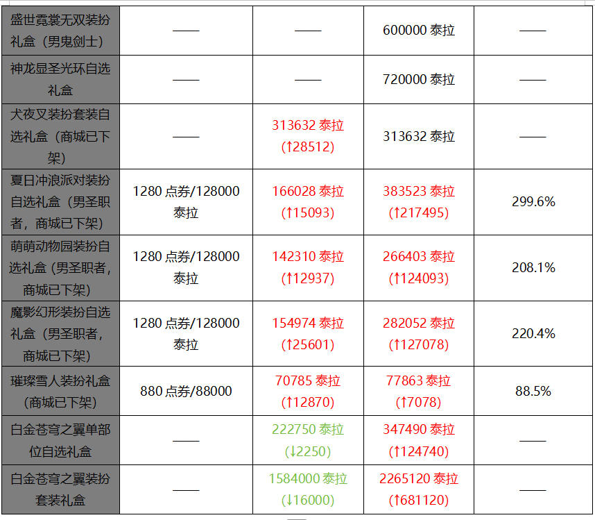 除此之外,男圣职者之前预售的三套绝版装扮,价格也出现了大幅提升,尤其是夏日装扮,目前价格相比前几天涨了一倍多,其点券收益已经接近300%了;白金天空相关礼包价格也出现了较大幅度的增长,不得不说男圣职者玩家群体是真有实力啊