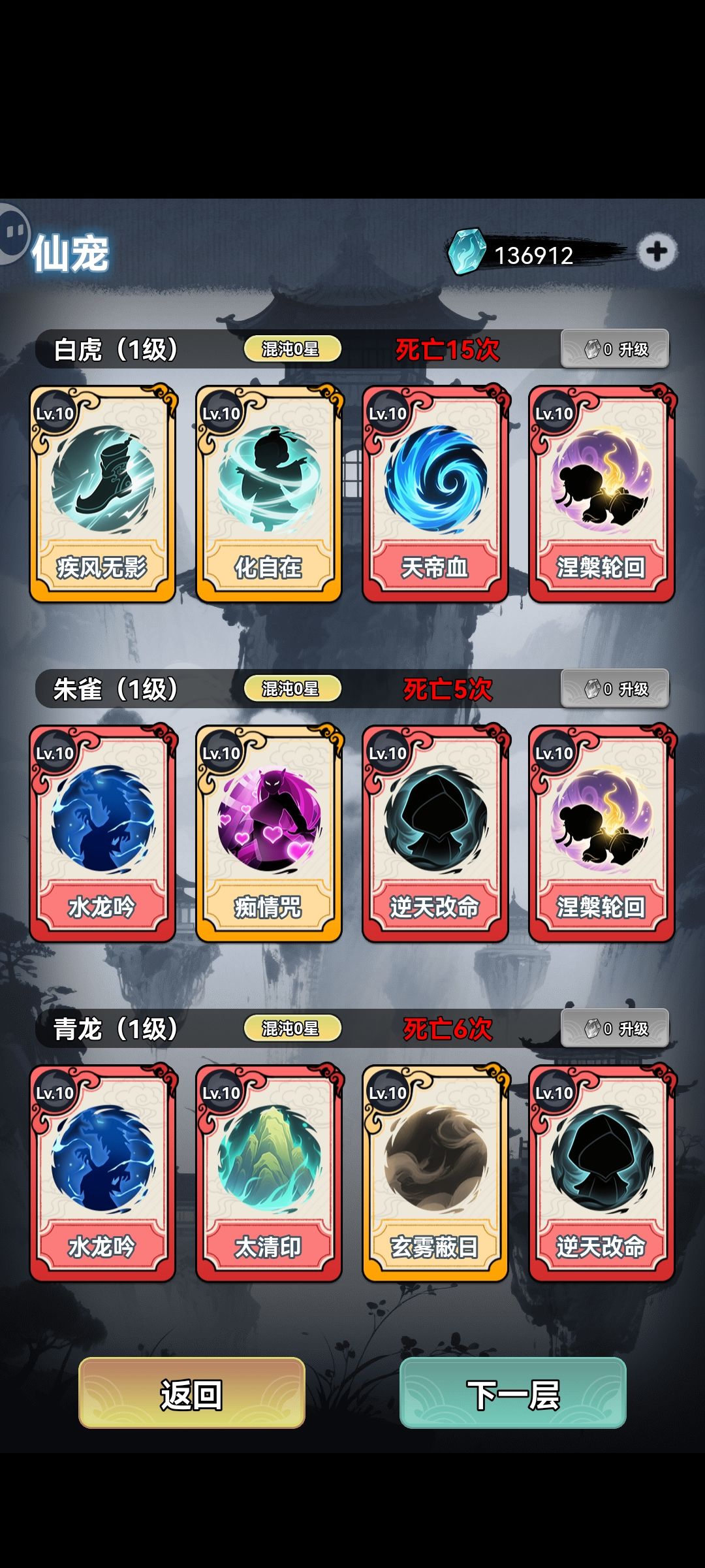 至于仙宠,这个怎么说呢,随便整整就行,参考我上面的就行,这个不是很重要,有仙宠过图过得更稳更快一点,没有的话也无伤大雅,后期宠物很容易暴毙,青龙和凤凰还好一点,学个技能水龙吟免疫2秒伤害,白虎纯属白给,加个涅槃都活不过两秒。