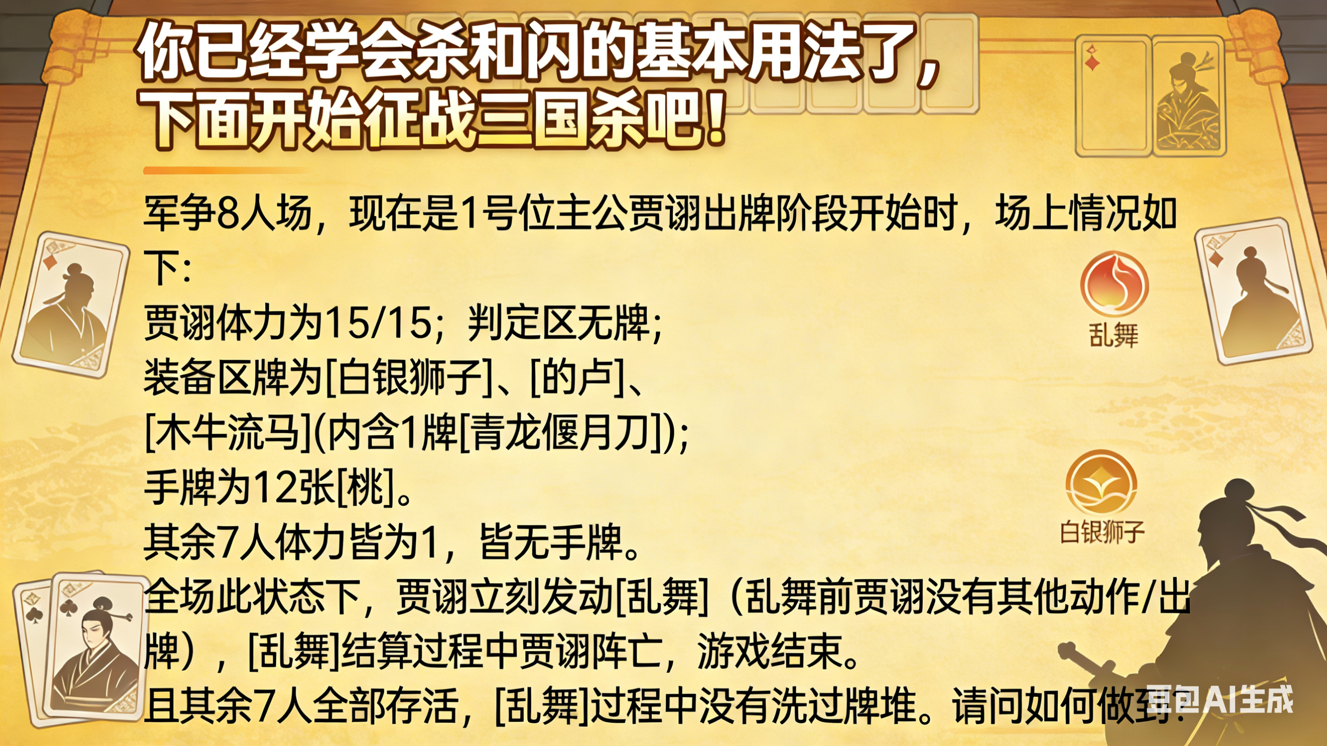 2.情景过于复杂,新手更加需要的是先对每张牌的效果有一个大致的印象和了解,如:调兵遣将可以让敌人要么杀队友要么给牌,也可以让队友去补刀;有乌骓出杀可以摸牌;藤甲能挡对决,烽火,万剑伤害,不需要去响应等等。