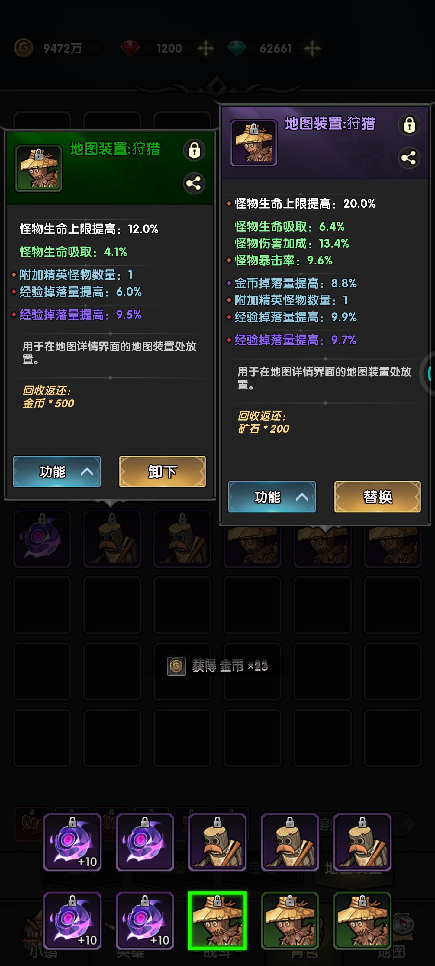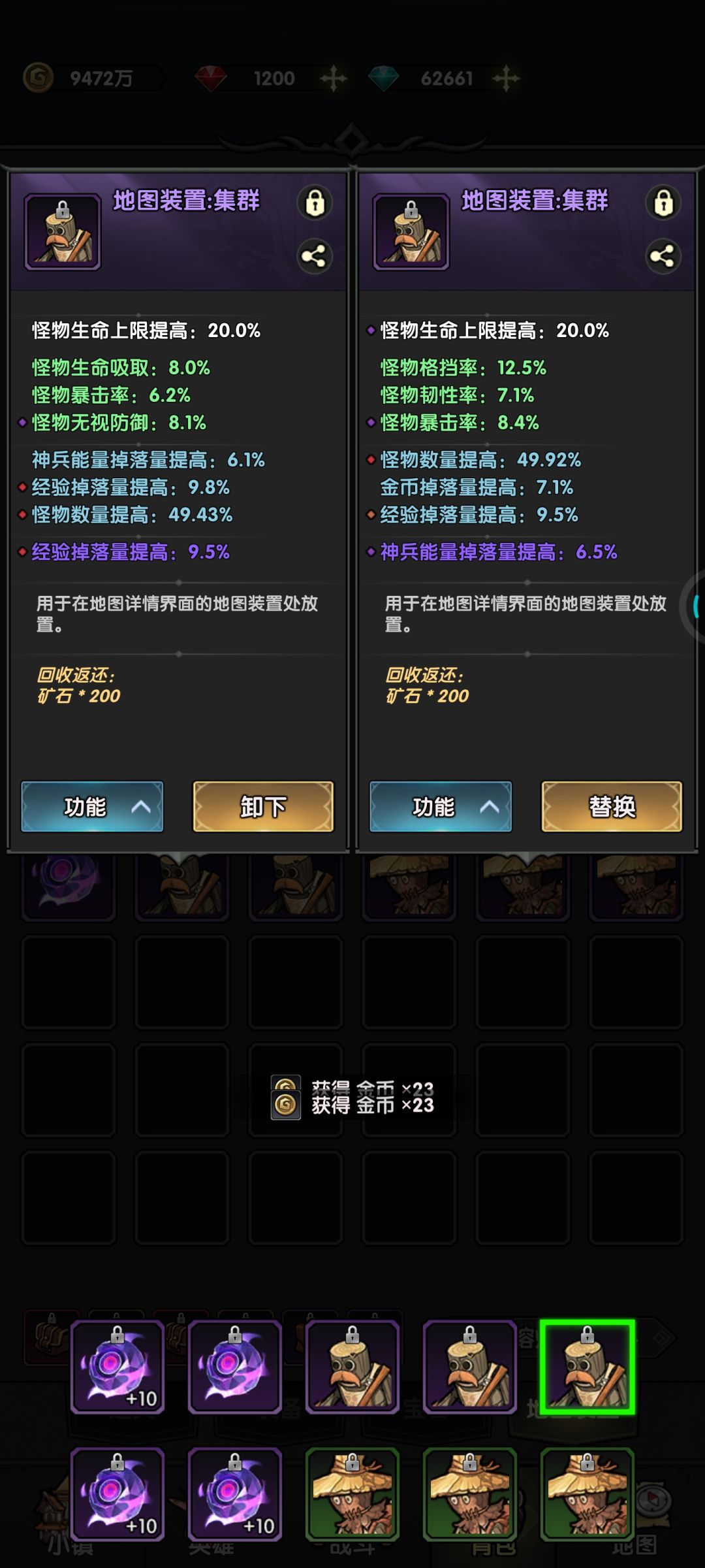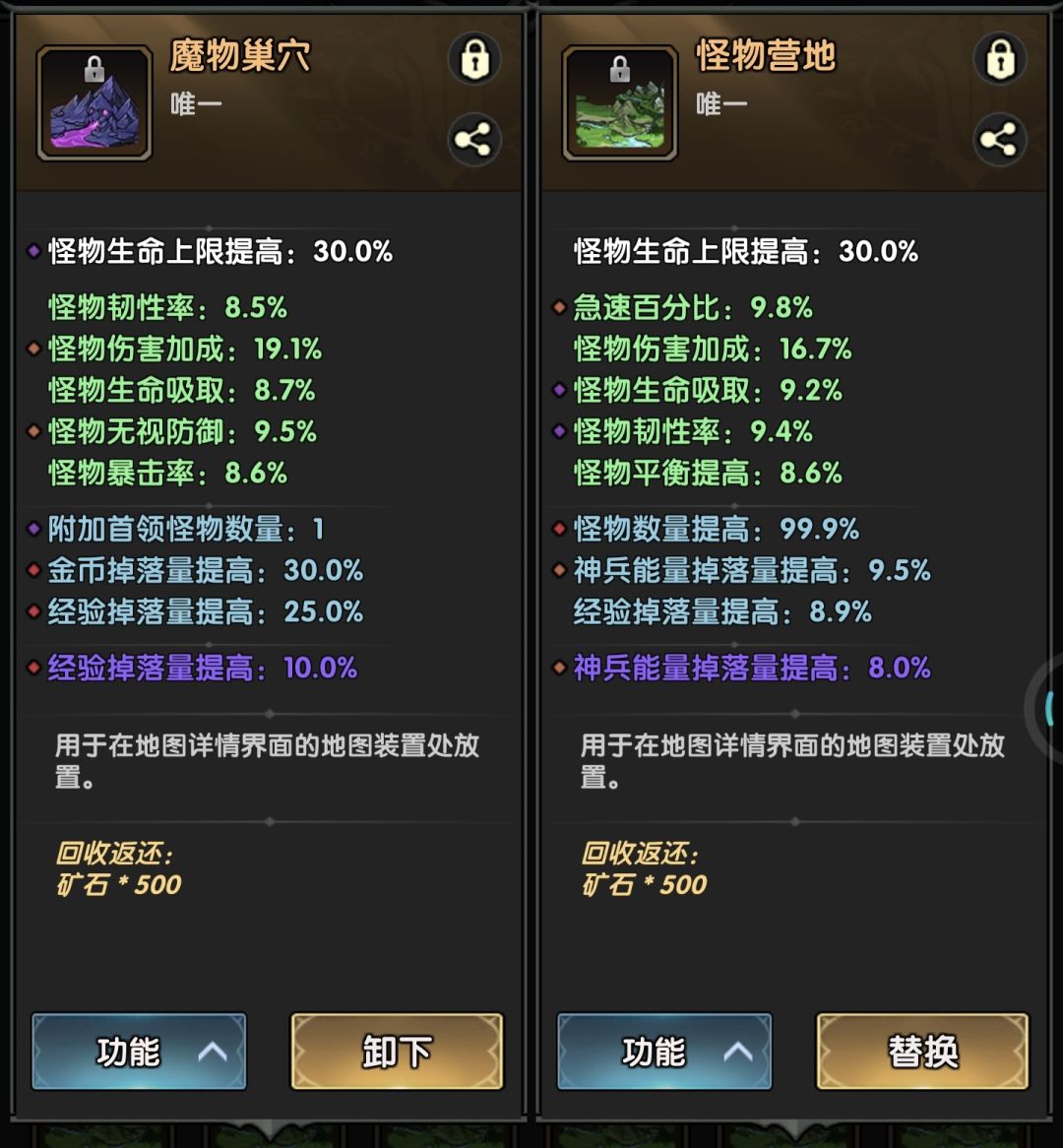 重点就是地图装置。选三个紫色集群。其中最重要的属性是怪物数量,必须49以上,不到49的不投入资源洗练。后期怪物数量对经验加成影响大。经验掉落量提高9.5以上就行,到后面0.5的经验影响真的很小。其他属性(金币,神兵能量)通通靠边站。腐化属性是经验加成就行