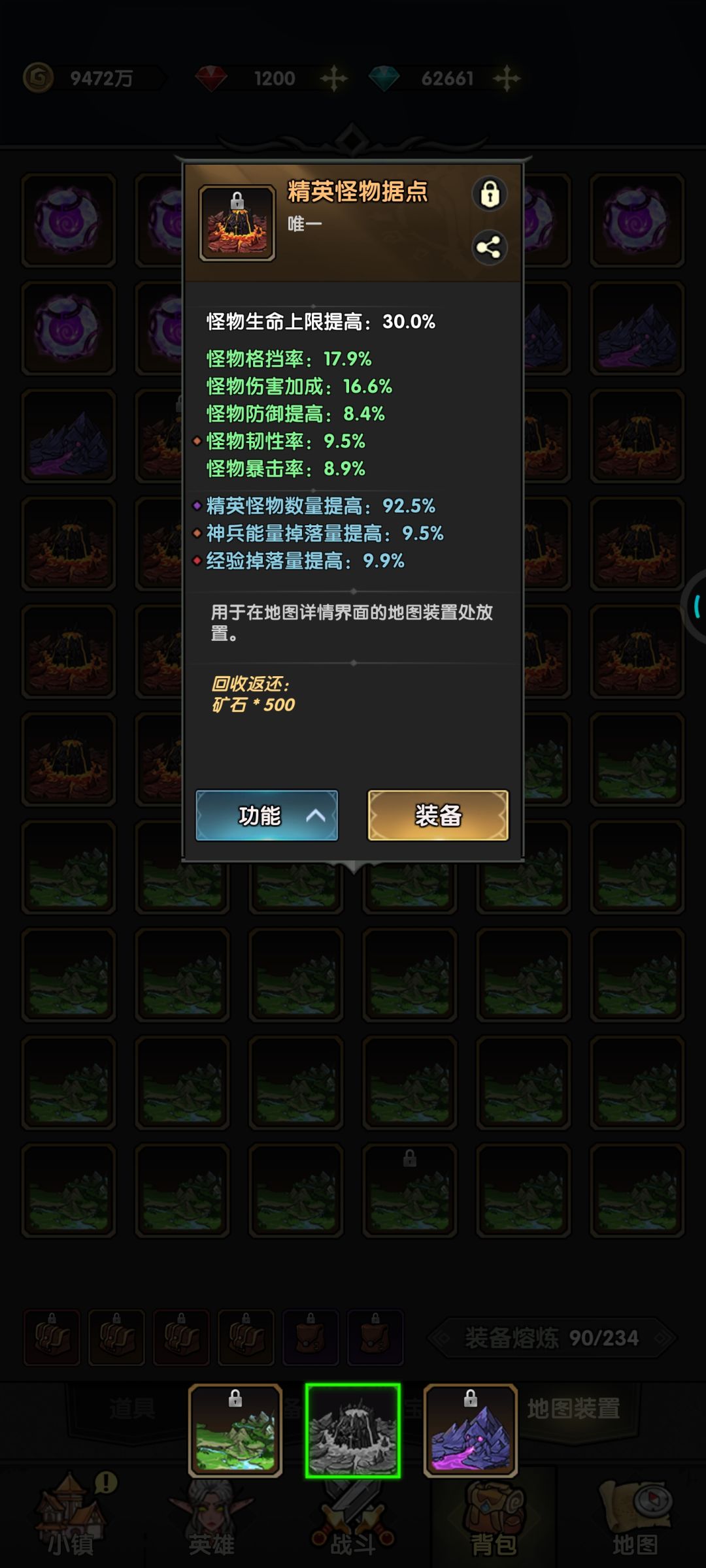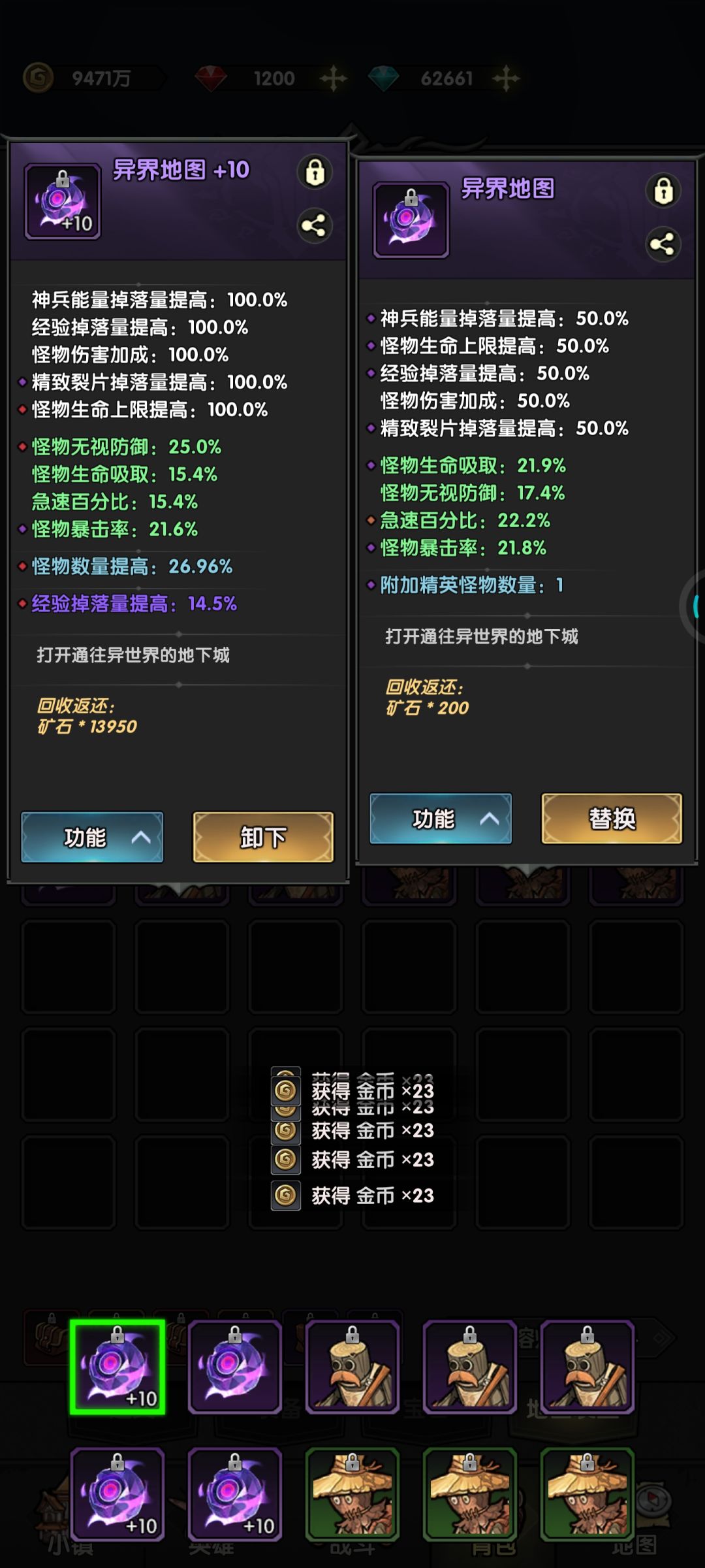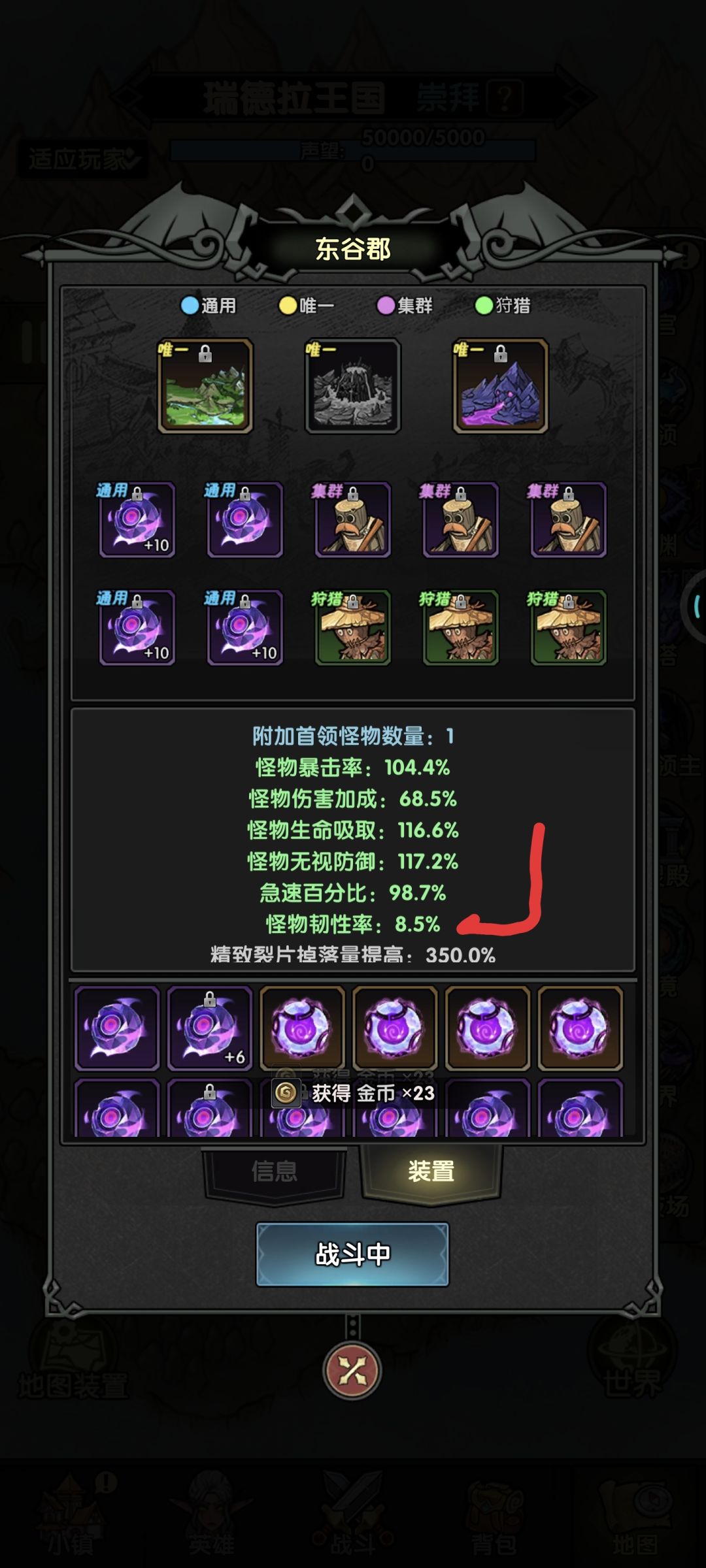 重点就是地图装置。选三个紫色集群。其中最重要的属性是怪物数量,必须49以上,不到49的不投入资源洗练。后期怪物数量对经验加成影响大。经验掉落量提高9.5以上就行,到后面0.5的经验影响真的很小。其他属性(金币,神兵能量)通通靠边站。腐化属性是经验加成就行