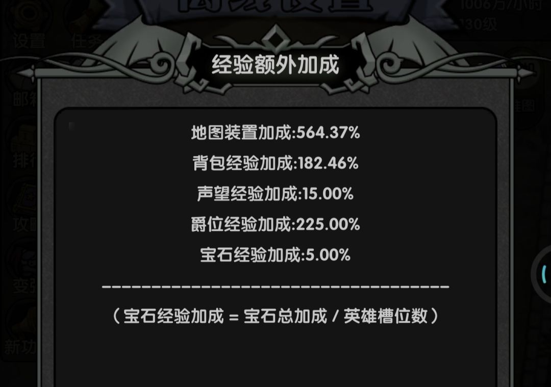 这里已经告诉我们提升经验加成的办法,我们能掌控的是地图装置,背包加成,宝石加成