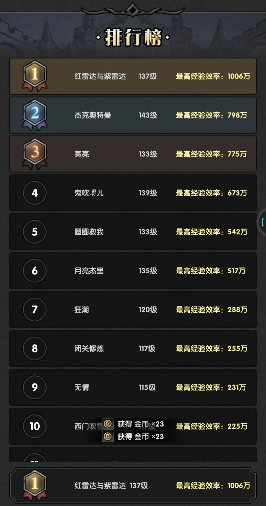 目前效率第一,与第二名拉出明显差距。按我的规划,不考虑等级提升的前提下,效率可以提升到1130万。还有上限更高的方式,不过我的战力依然不够支撑。后面分享