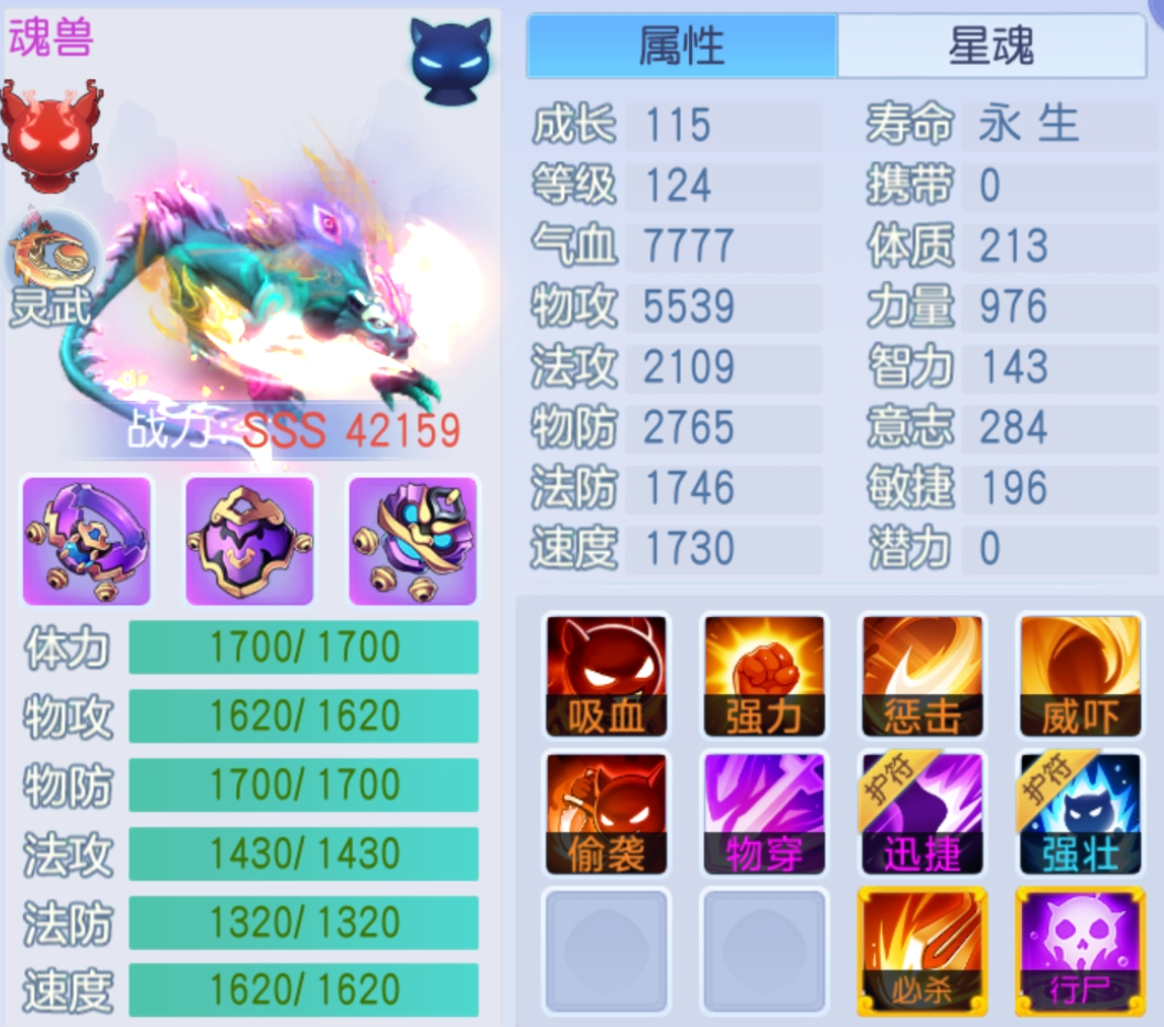 宠物属性意志为主,体质为辅,气血1.1w+,物防4700,生存尚可。物防面对700左右物伤略显不足,建议体质为主。速度1700+快但用处不大。