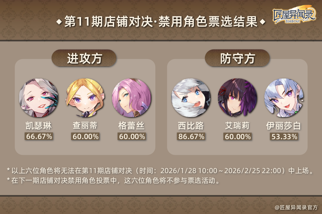 以上四位店员将无法在第11期店铺对决(时间:2026/1/28 10:00~2026/2/25 22:00)中上场。同时,在第12期店铺对决禁用角色投票中,这四位角色将不参与票选活动,不会出现在候选名单中哦~