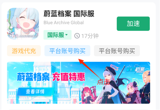 2. 安卓安装完成后,退出并进入手游加速页面,点击“账号购买”进行购买。