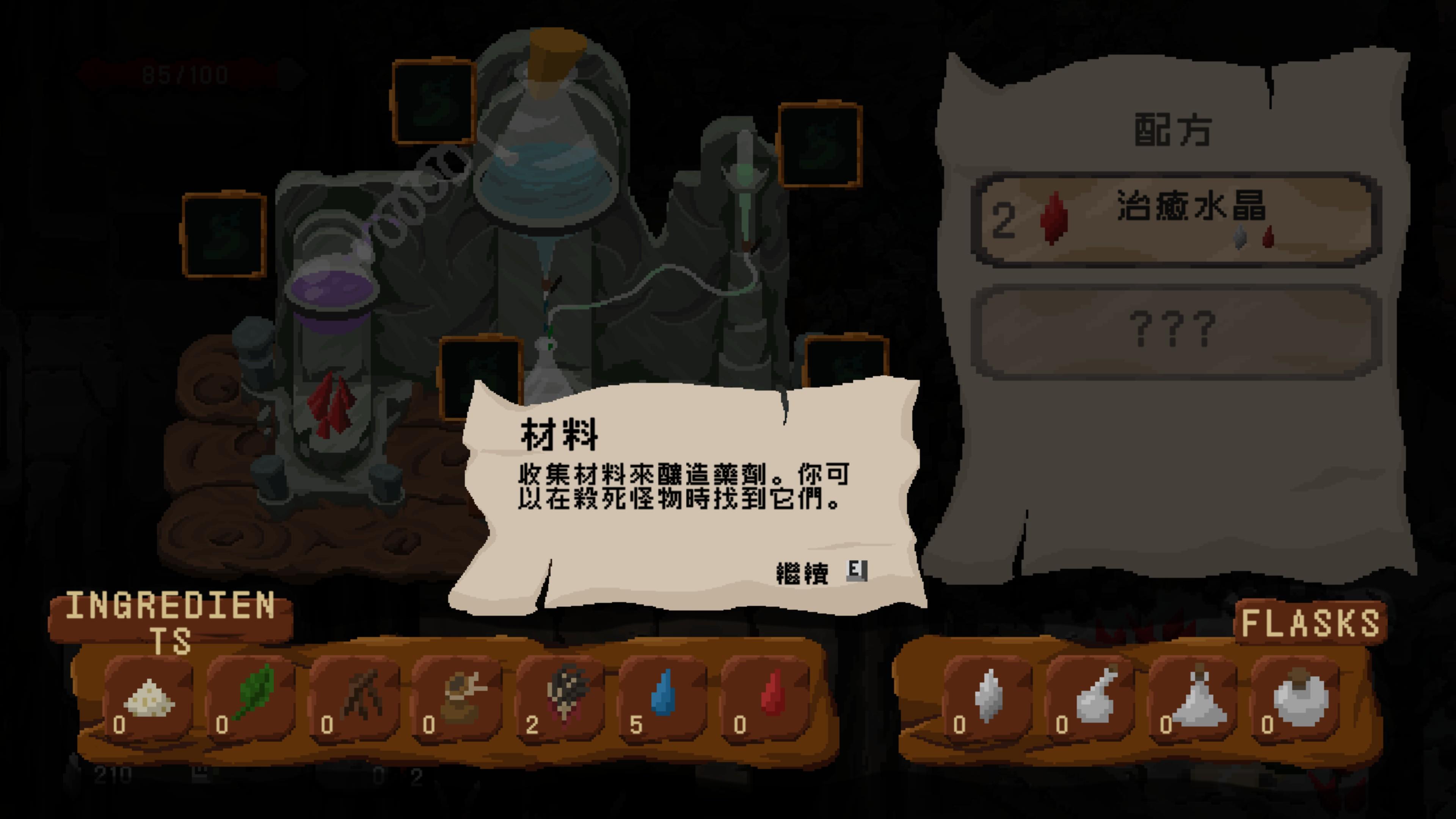 在遗迹中还有一个神奇的玩意儿,【炼金台】,杀死那些虫子和敌人会掉落一些奇怪的材料,在解锁一些配方后就可以在这上面进行合成。
