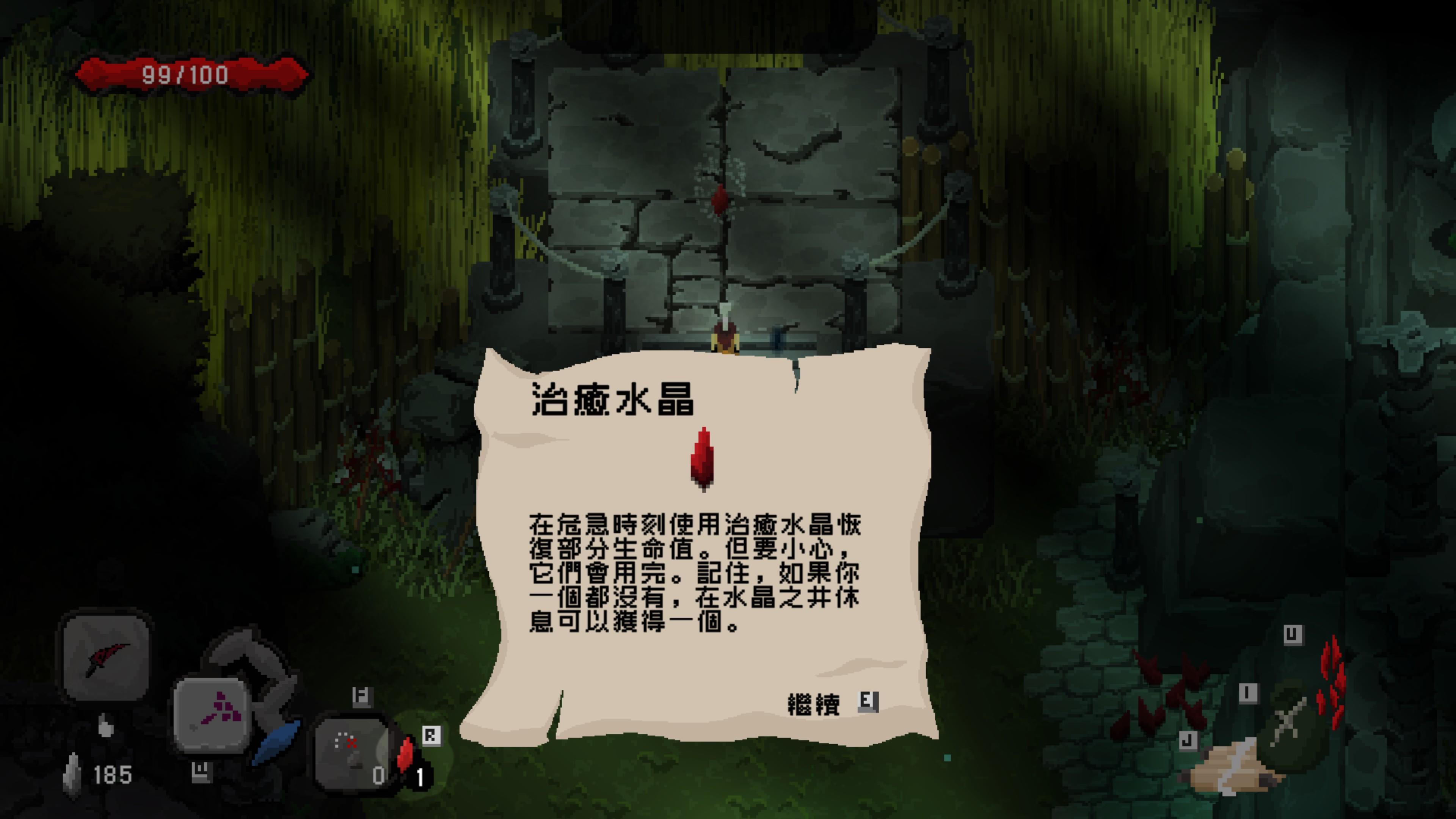 这座遗迹当中不仅有怪物还有大量的机关陷阱,走着走着就可能被刺一下,但同时也伴随着机遇,比如说我刚刚见到的这枚治疗水晶,让我多了一次回血的机会。