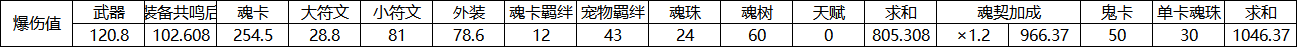 需要注意的点是:若携带魂契,魂契提供的20%爆伤增幅,需要剔除鬼卡提供的50爆伤和单卡魂珠通用效果的30爆伤后(最终爆伤不参与计算)进行计算,算出的结果再加上鬼卡和单卡魂珠。