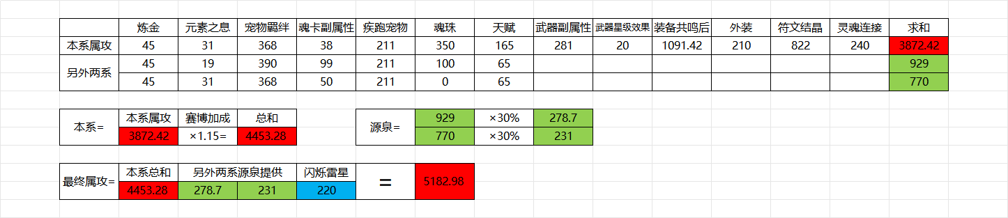 只要使两个系数相乘所得值最大即为伤害最高。因为法师有天赋源泉会影响本系属攻,所以需要同时计算三系的属攻。以下是除去宝石外的属攻和爆伤的来源及计算方式。