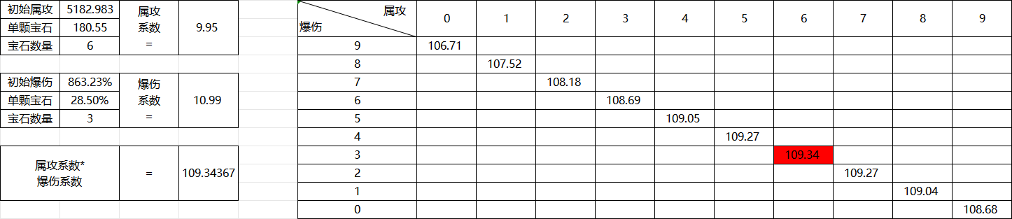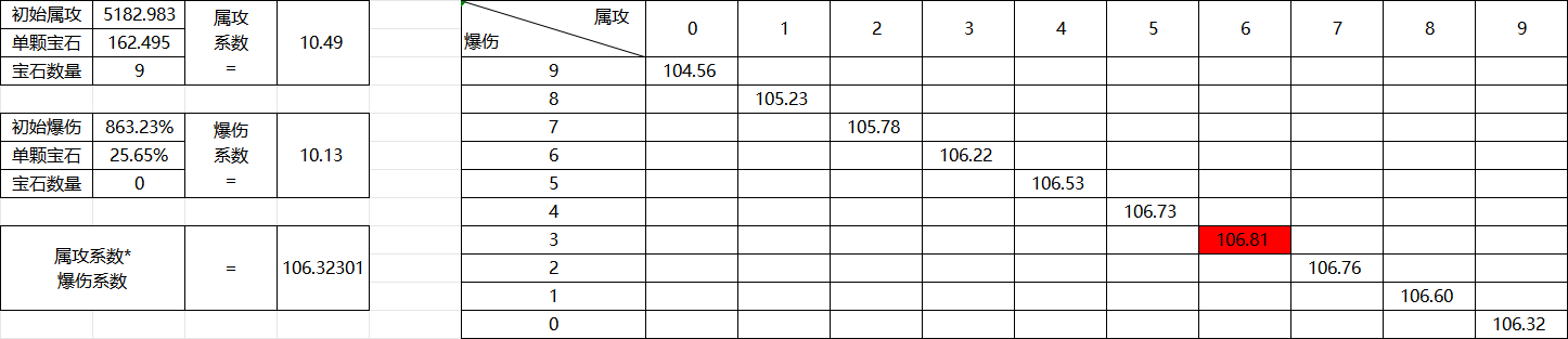 将0∽9依次代入可得在属攻宝石为6时,最终系数的值最高