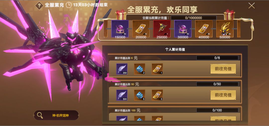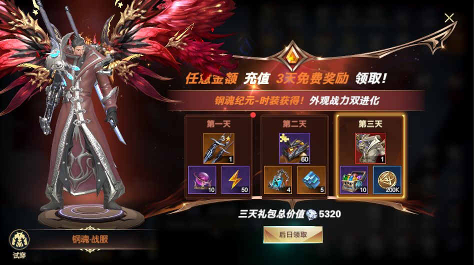 充值任意金额即可获得【3星传说武器】、【熔核魔皇】、【钢魂纪元·衣服】等奖励