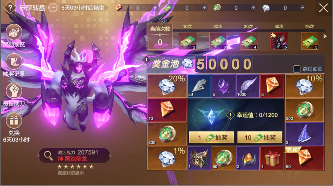 活动期间,转动转盘,可获得【黑蚀帝龙】、【华彩之侍 时装】、【翼灵自选】等奖励!