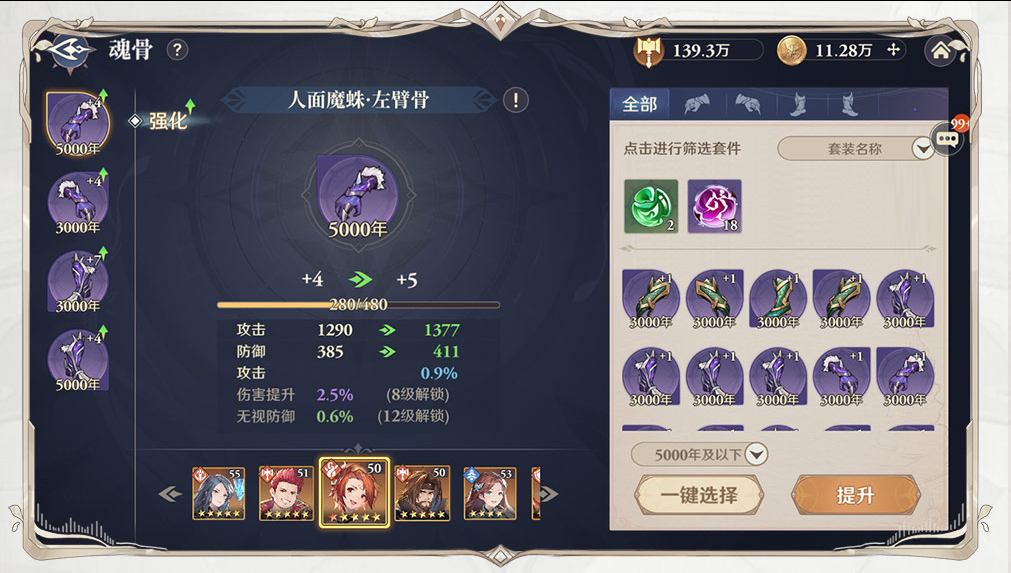 选择了合适的阵容之后,剩下的就是努力提升上阵魂师的等级、进阶、星数等。然后就是给每一个魂师搭配魂环和魂骨,搭配的思路以年份优先,推荐优先。剩下的就是按照刚才上面所说的思路每日把礼物送完给SSR魂师,把现有的资源转换成战力~