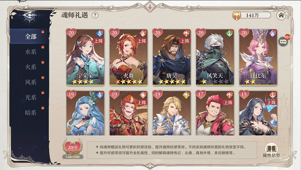 3、赠送的礼物如果是符合魂师派系,则好感度加成更多,因此在初期送礼的时候,优先将各个派系的SSR魂师送到10级,然后再平均升到15级,以此类推,就可以在魂师礼遇上获得最高性价比的战力收益。