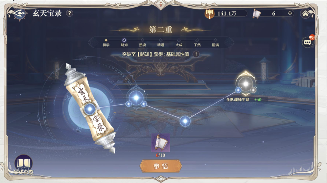 2、修炼玄天宝录,可提升全体上阵魂师属性。也有一定的战力加成!