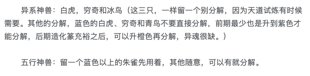 20.孵化神兽 —— 【神兽】界面有一个【神兽图鉴】,点进去之后正中间的紫色树冠上有一颗【蓝蛋】,这是彩蛋每天刷新。关于彩蛋详情见【任务61】,因为现在你一路做任务没时间找彩蛋。另外商盟的地源堂里有一颗蓝蛋,可以买了拼拼欧气,万一出紫色朱雀了呢。我还在这个帖子里看到了关于神兽分解的建议 https://www.taptap.cn/moment/564388917155991159?share_id=e5db8c1bda93&utm_medium=share&utm_source=copylink 因为这个帖子图太多了,我直接截图贴出来。