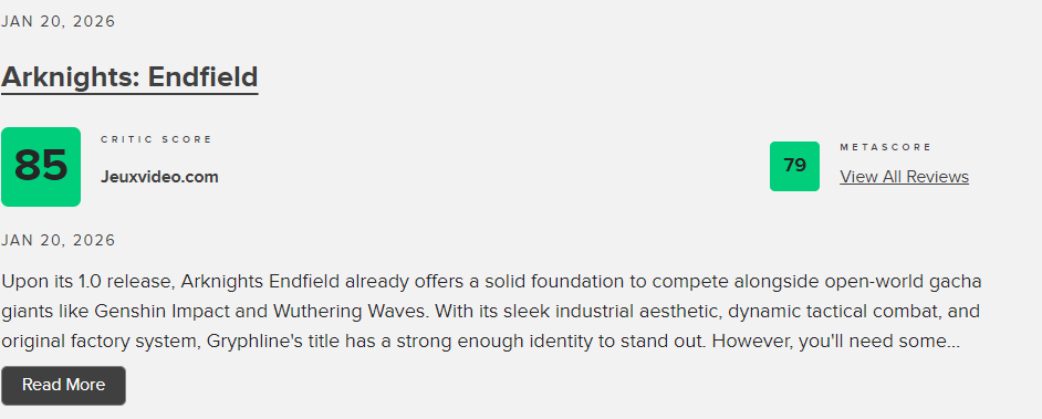 《明日方舟:终末地》媒体评分解禁:MC均分79