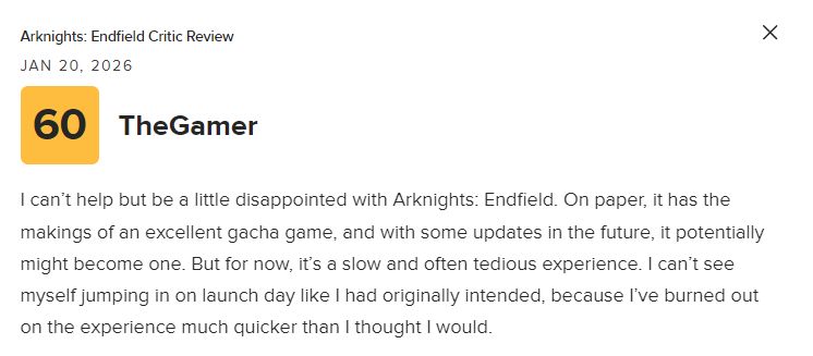 TheGamer则仅给出60分,直言体验进展缓慢且乏味,对游戏当下表现感到失望,虽认可其潜在潜力,但自身厌倦速度超出预期。