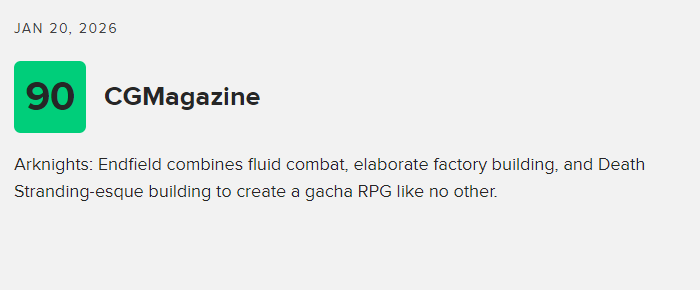 CGMagazine 给出90分高分,称赞游戏融合流畅战斗、复杂工厂流水线与《死亡搁浅》式建造元素,打造出独一无二的抽卡RPG体验。