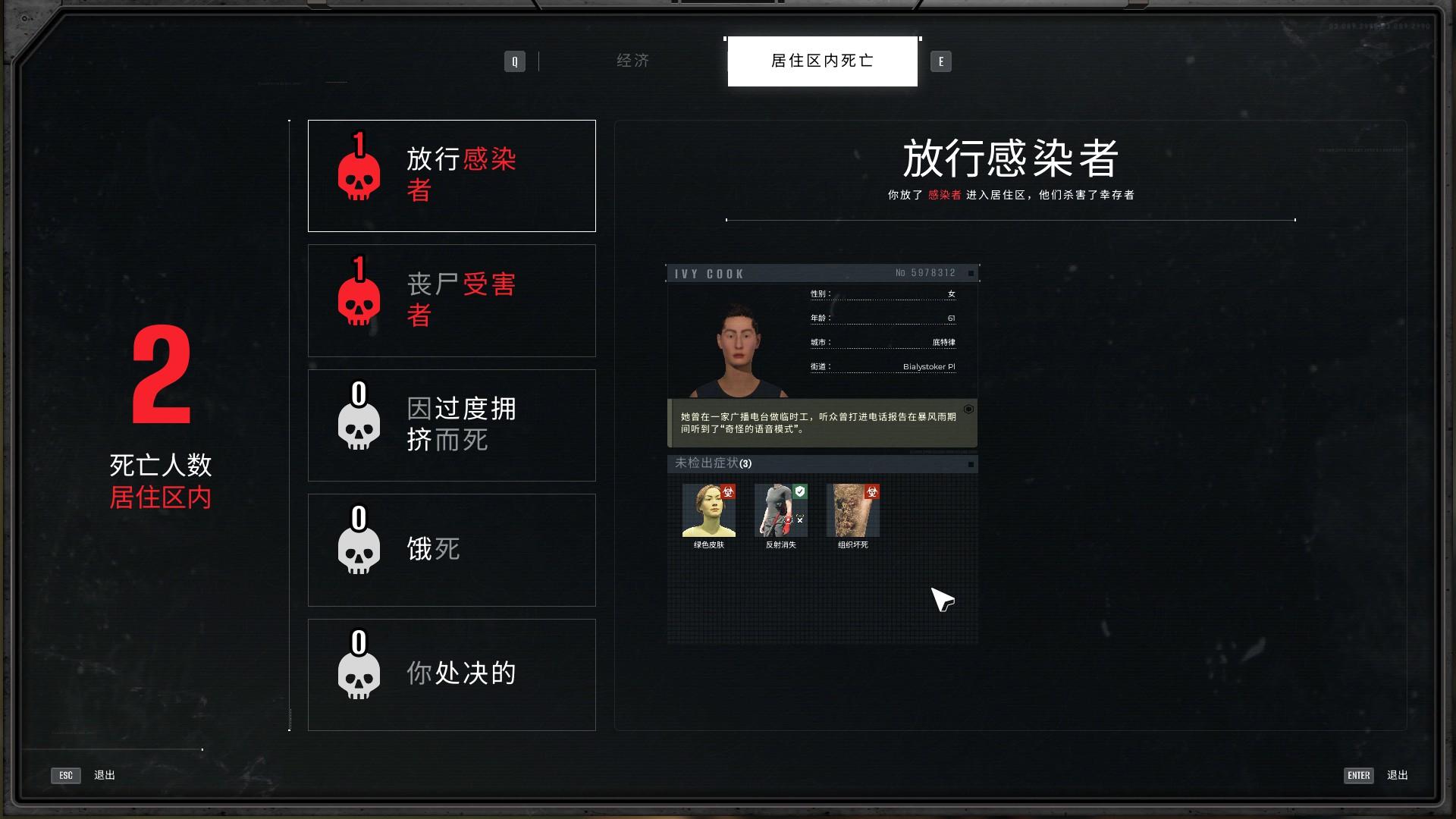 检测完成分配对应区域之后,系统会对本次检测打分,前期检测手段不多的时候,很容易获得合格和优秀评价,但是后期检测内容多了之后,患者的症状变得不明显了,想要拿到合格评价都变得比较困难了,有时候各项检测都仔细做了,全身上下也都扫描,自以为做的很完美了,但是却给了一个糟糕的检查,就挺迷惑的。就个人游玩和评论来看,似乎更像是BUG,比如笔者就曾经放一个无症状的感染者进了居住区,但是仔细一看症状有”绿色皮肤“,但是检测时是褐色皮肤,根本没有绿色特征。